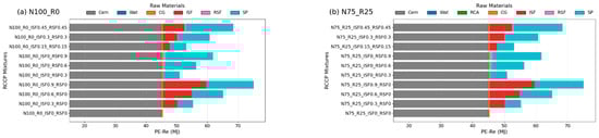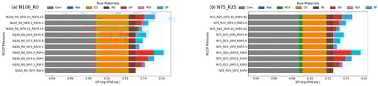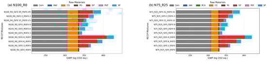 The life-cycle inventory (LCI) quantified material/energy inputs and emissions/wastes. Environmental data for the superplasticizer were taken from an International EPD database []. Cement and background data were sourced from ELCD []; RCA data came from suppliers, on-site surveys, and the literature [,,]; ISF/RSF data were obtained from local suppliers, with RSF impacts based on Kurda et al. []. Aggregate and water data followed [,], reflecting appropriate regional and technological conditions.