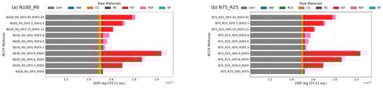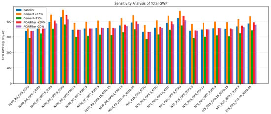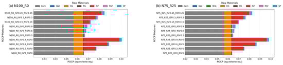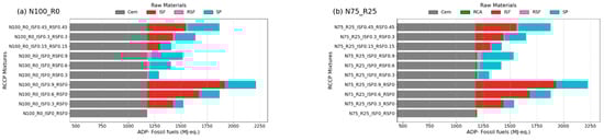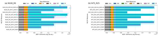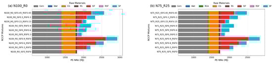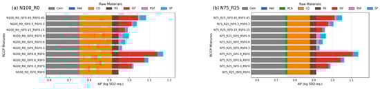 The life-cycle impact assessment (LCIA) covered eight EN 15804:2012+A1 categories: global warming potential (GWP), ozone depletion (ODP), acidification (AP), eutrophication (EP), photochemical ozone creation (POCP), abiotic depletion—elements and fossil fuels (ADP-elements, ADP-fossil), and primary energy demand (renewable and non-renewable: PE-Re, PE-NRe). CML was applied for GWP, ODP, AP, EP, POCP, and ADP; cumulative energy demand (CED) was used for energy indicators. Impact factors for each raw material (Table 5 and Table 6) were multiplied by their quantities in Table 4 to obtain total impacts per 1 m3. Sensitivity analyses varied cement emissions by ±15% and RCA/fiber GWP by ±20% to address uncertainty and test robustness.