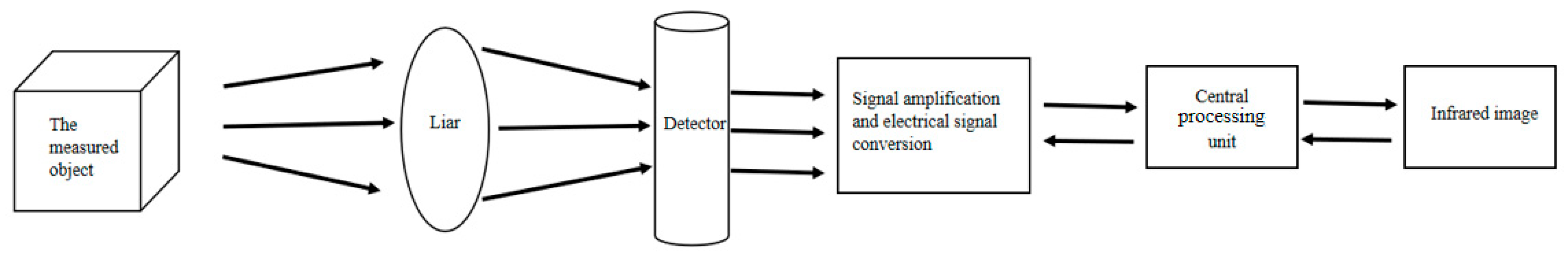 In this study, the temperature field during asphalt pavement construction was monitored using a DJI Matrice 300 RTK unmanned aerial vehicle (UAV) equipped with a Zenmuse H20T infrared thermal camera. This UAV is designed and manufactured by Shenzhen DJI Innovation Technology Co., Ltd., and its headquarters is located in Shenzhen, Guangdong Province, China. The Zenmuse H20T is manufactured by SZ DJI Technology Co., Ltd., with its headquarters located in Shenzhen, Guangdong Province, China. The processed thermal imagery provides a resolution of 1280 × 1024 pixels and a temperature measurement accuracy of ±2 °C. The integrated professional analysis software supports real-time visualization of the temperature field, enabling rapid identification of temperature anomalies with an inspection efficiency of 20,000 m2/h. This technology allows for non-contact, large-area monitoring (with a single measurement swath of up to 10 m) and offers excellent spatial continuity of temperature data, accurately reflecting temperature distribution gradients. Furthermore, the inspection process does not interfere with normal construction operations, making it particularly suitable for real-time quality control during asphalt paving and compaction [15]. Results demonstrate that the temperature data acquired by the system exhibit a correlation coefficient of 0.98 with actual pavement temperatures, providing reliable technical support for construction quality control. At the same time, compared with other traditional detection approaches, UAV infrared technology has the advantages of fast, wide detection range and high safety. The basic principle is illustrated in Figure 1.