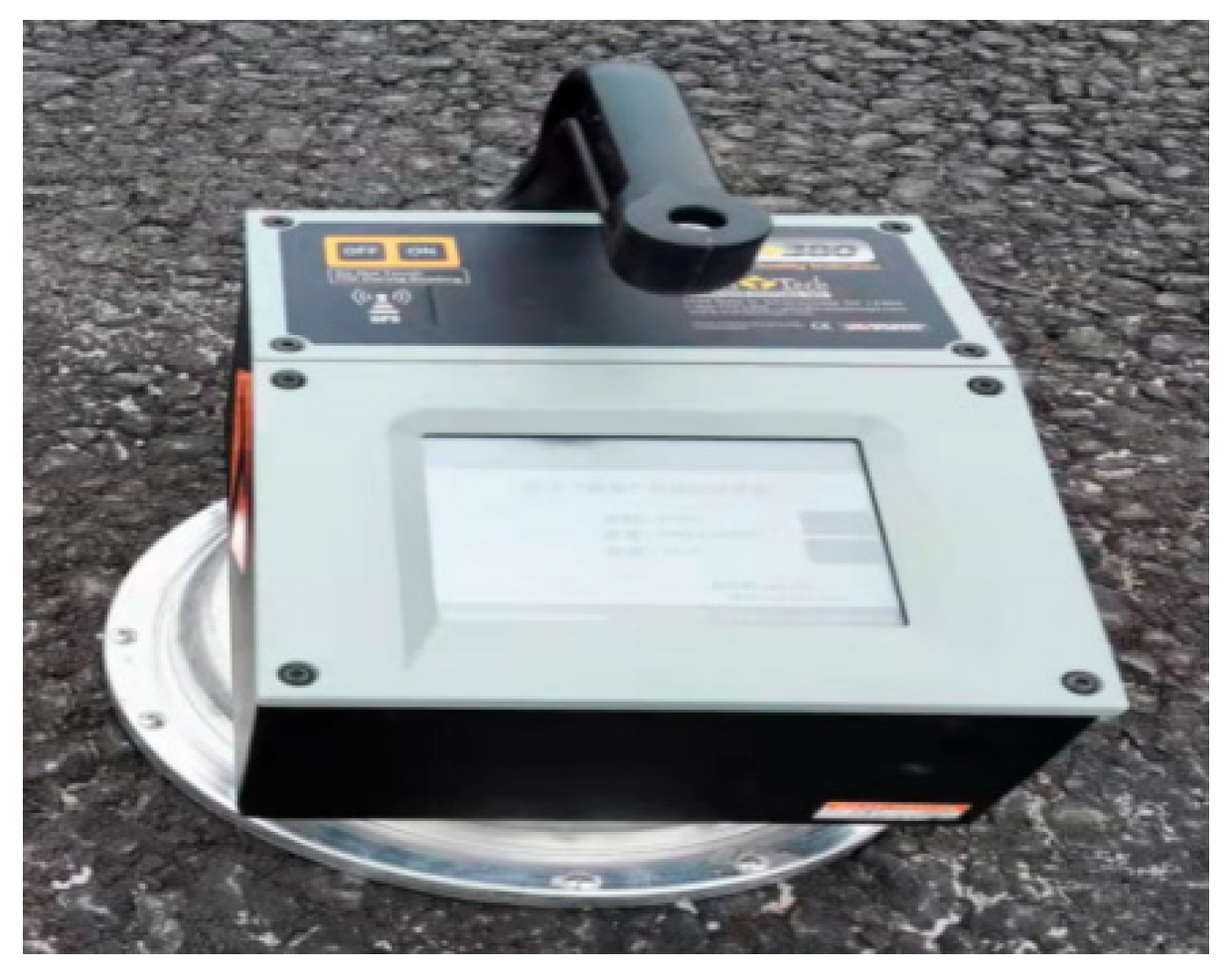 The annular antenna at the base of the non-nuclear density gauge emits electromagnetic waves. As these waves propagate through the asphalt mixture, variations in the material’s dielectric properties alter the wave propagation parameters, such as velocity and direction. These alterations are detected by the receiving antenna. By analyzing the signal differences and incorporating parameters like the composite resistivity and dielectric constant of the material, the density of the asphalt concrete is calculated using built-in algorithms. The core principle of this technology lies in quantifying the changes in electric field intensity induced by the dielectric material through its dielectric constant, thereby enabling non-destructive density measurement. This method avoids the destructive nature of traditional core sampling and provides an efficient and convenient technical means for quality control in pavement construction [16]. The PQI380 is a new-generation non-nuclear asphalt density tester manufactured by TransTech Systems, New York, NY, USA, designed for rapid measurement of asphalt pavement density and compaction level, making it suitable for on-site construction quality control. The display is shown in Figure 2.