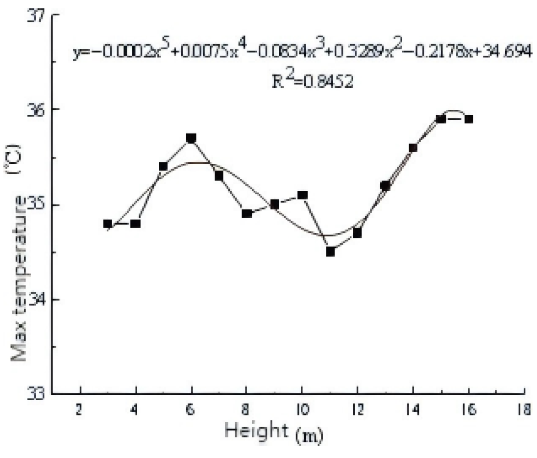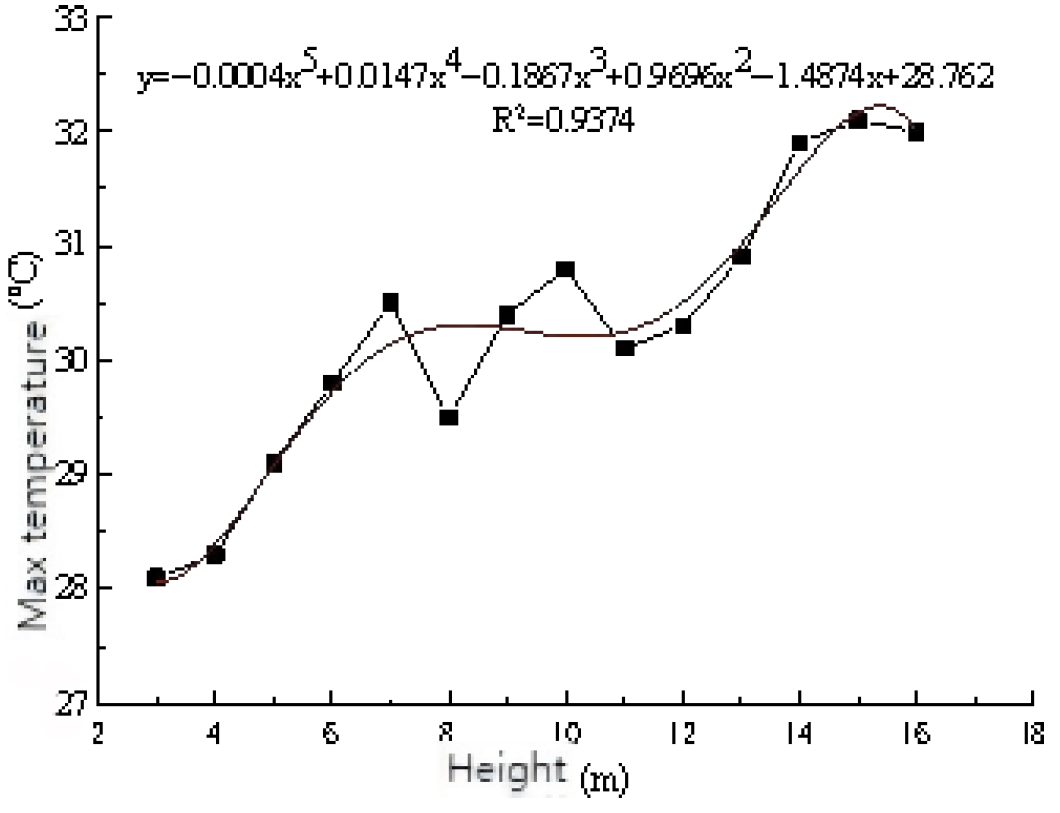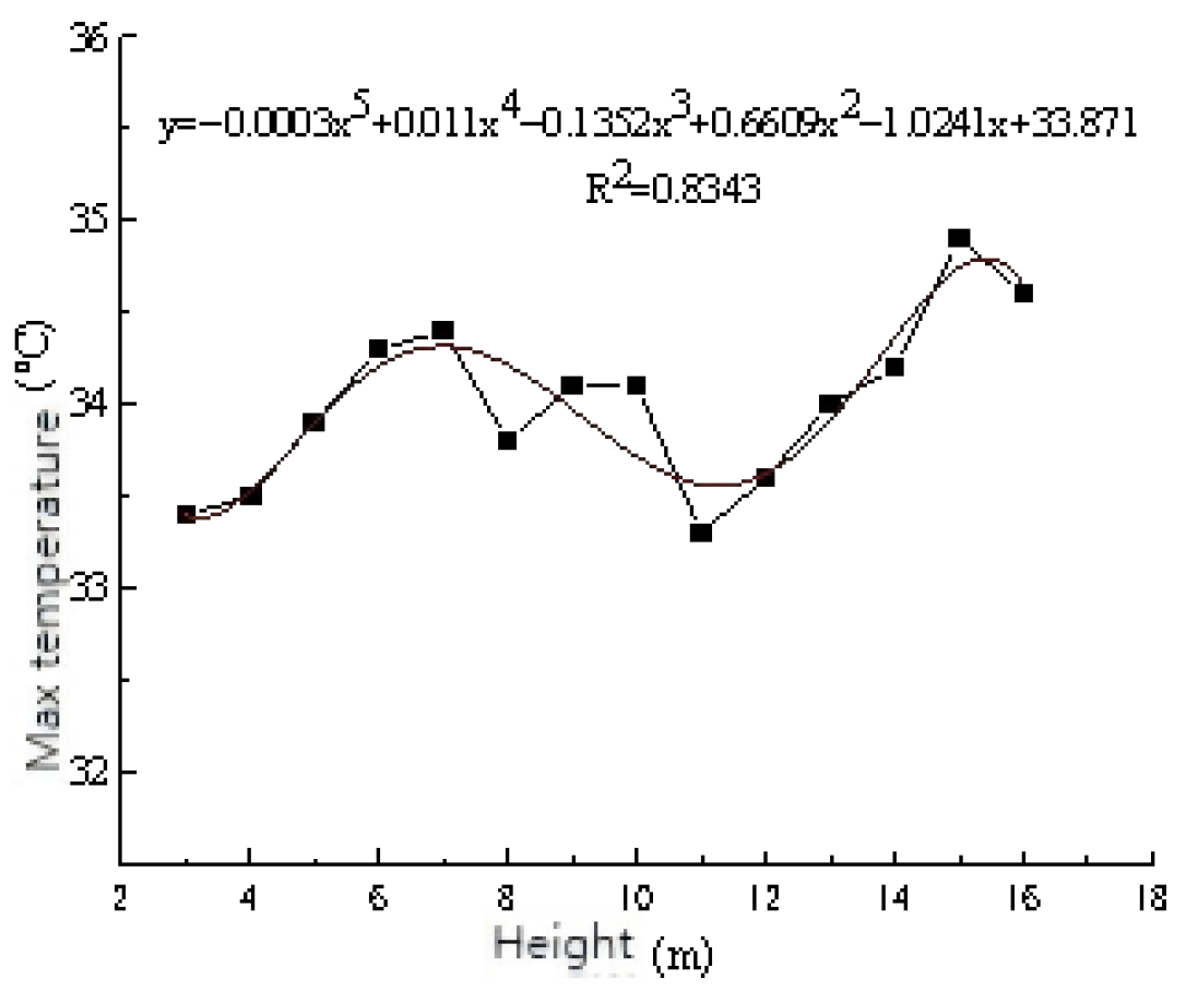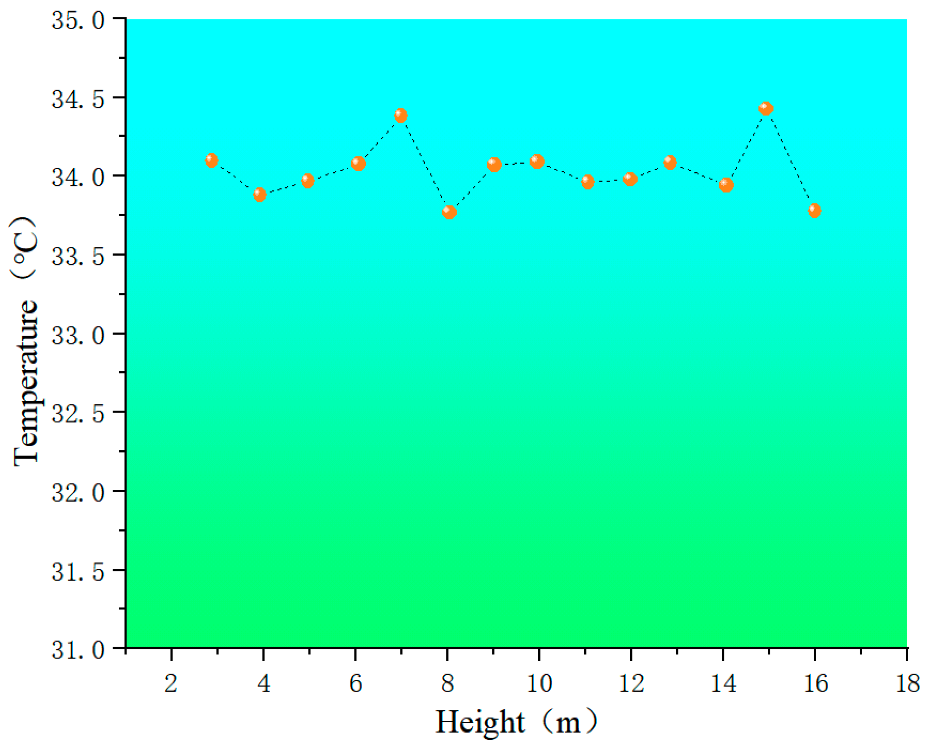As shown in Figure 8, Figure 9 and Figure 11, Analysis of the temperature distribution curves reveals that the average temperature curve closely follows the trend of the maximum temperature curve. Although minor temperature fluctuations were observed across different measurement heights, the temperature difference between adjacent heights did not exceed 1 °C. The maximum temperature remained stable at approximately 35 °C, while the average temperature hovered around 34 °C. In contrast, the minimum temperature curve, despite exhibiting a similar trend, fluctuated around 30 °C.