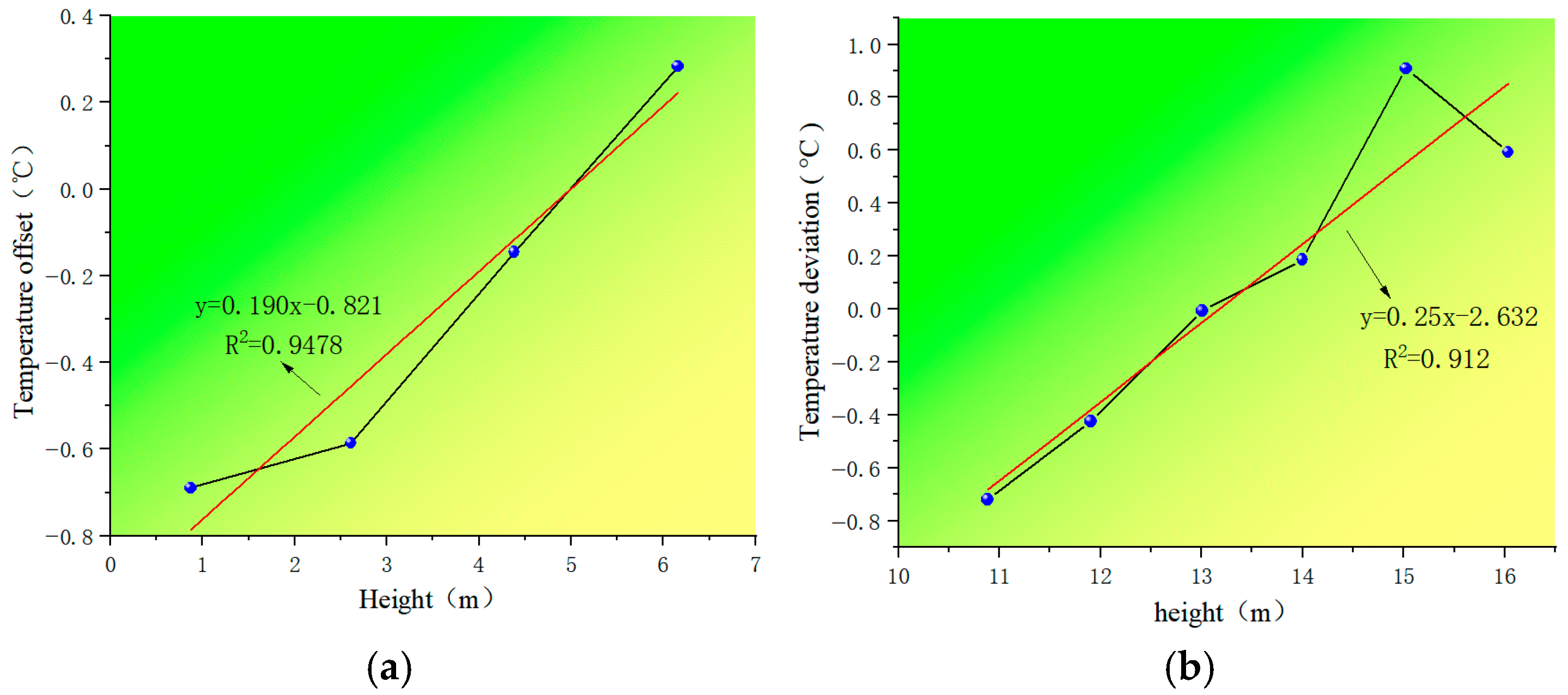 Based on the analysis of the average temperature data in Table 5 and the corresponding fitted curve, the data measured within the height intervals of 3–6 m and 10–16 m necessitate correction. The specific correction values are provided in Table 6.