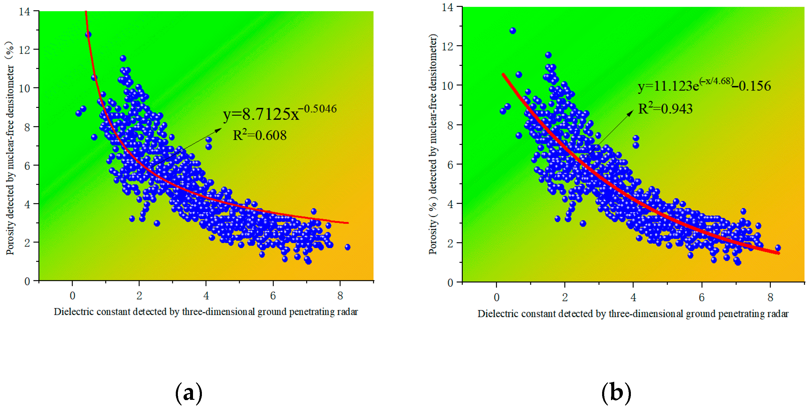 where ε x is the dielectric constant measured by the 3D GPR surface reflection method, and a, k, and b are correction coefficients.