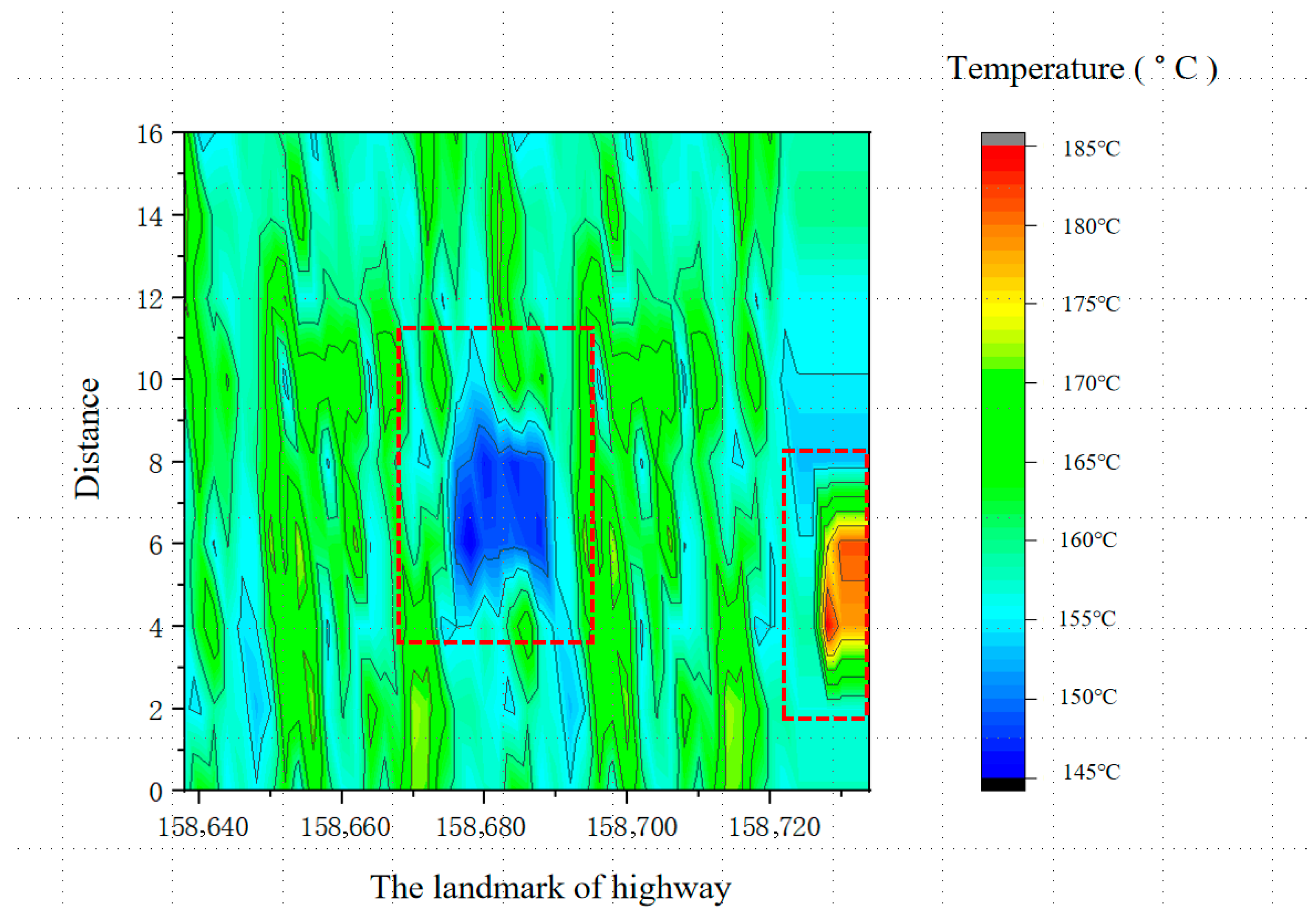 A comparative analysis revealed that the mercury thermometer readings were significantly lower, while the results from the other three measurement methods were generally consistent. This discrepancy can be primarily attributed to the fact that the mercury thermometer requires approximately five minutes to stabilize, and it is susceptible to significant random errors, necessitating multiple measurements to obtain a reliable average. However, frequent measurements not only impede construction efficiency but also introduce variability due to the rapid cooling of the asphalt mixture after paving, making it difficult to maintain consistent measurement conditions at the same location. Furthermore, the use of contact-based temperature measurement devices, such as the mercury thermometer, requires operators to work in close proximity to the freshly laid mat, posing potential safety hazards due to the subsequent roller operations. Comprehensive analysis demonstrates that UAV-based infrared thermal imaging offers distinct advantages, including targeted accuracy, intuitive data visualization, ease of data storage, and enhanced operational safety, making it more suitable for temperature monitoring during asphalt pavement construction [22]. The accuracy of the temperature data (error < ±1.5 °C) was validated against a calibrated handheld infrared thermometer (Fluke 62 Max+), which served as the reference for the actual pavement surface temperature. This validation was performed by comparing point measurements from the handheld device with temperature values extracted from the UAV thermal imagery at corresponding locations immediately after the UAV flyover. The demonstrated superiority of UAV-based infrared thermography represents a paradigm shift in pavement construction monitoring. While traditional contact thermometers introduce significant measurement delays incompatible with rapid asphalt cooling, the aerial method achieves comprehensive spatial coverage while maintaining validated accuracy (±1.5 °C). This technological transition addresses both methodological and safety concerns—eliminating personnel exposure to hazardous work zones while providing complete, real-time temperature documentation. Most significantly, the continuous thermal mapping enables proactive quality control by identifying localized anomalies that traditional spot measurements inevitably miss. This capability transforms quality assurance from statistical sampling to comprehensive evaluation, allowing for targeted corrective actions during the critical compaction window. The method establishes an objective, digital foundation for data-driven construction management and creates valuable historical records for lifecycle pavement performance analysis.