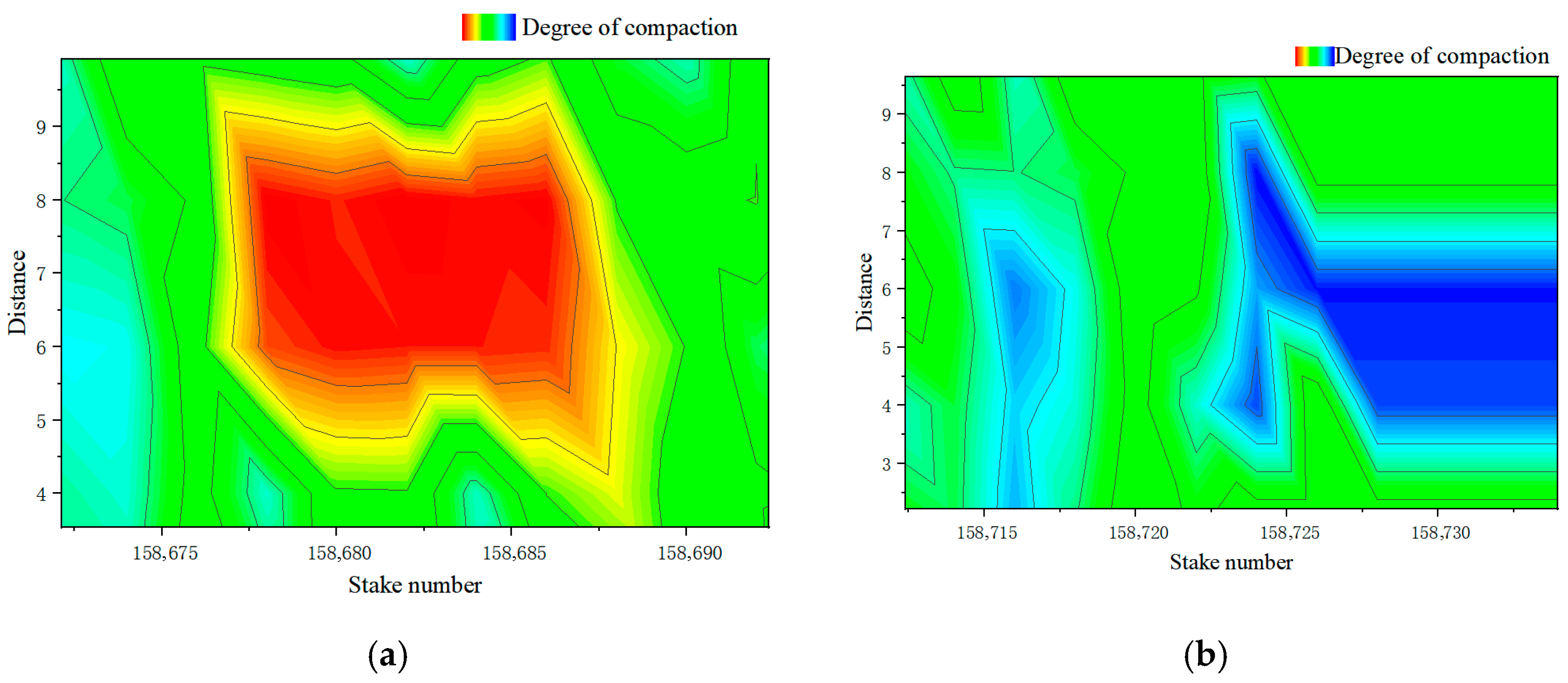 Figure 20. Non-nuclear densimeter microscopic discrete accurate detection of compaction degree cloud map. (a) Too low degree of compaction, (b) Too high degree of compaction.