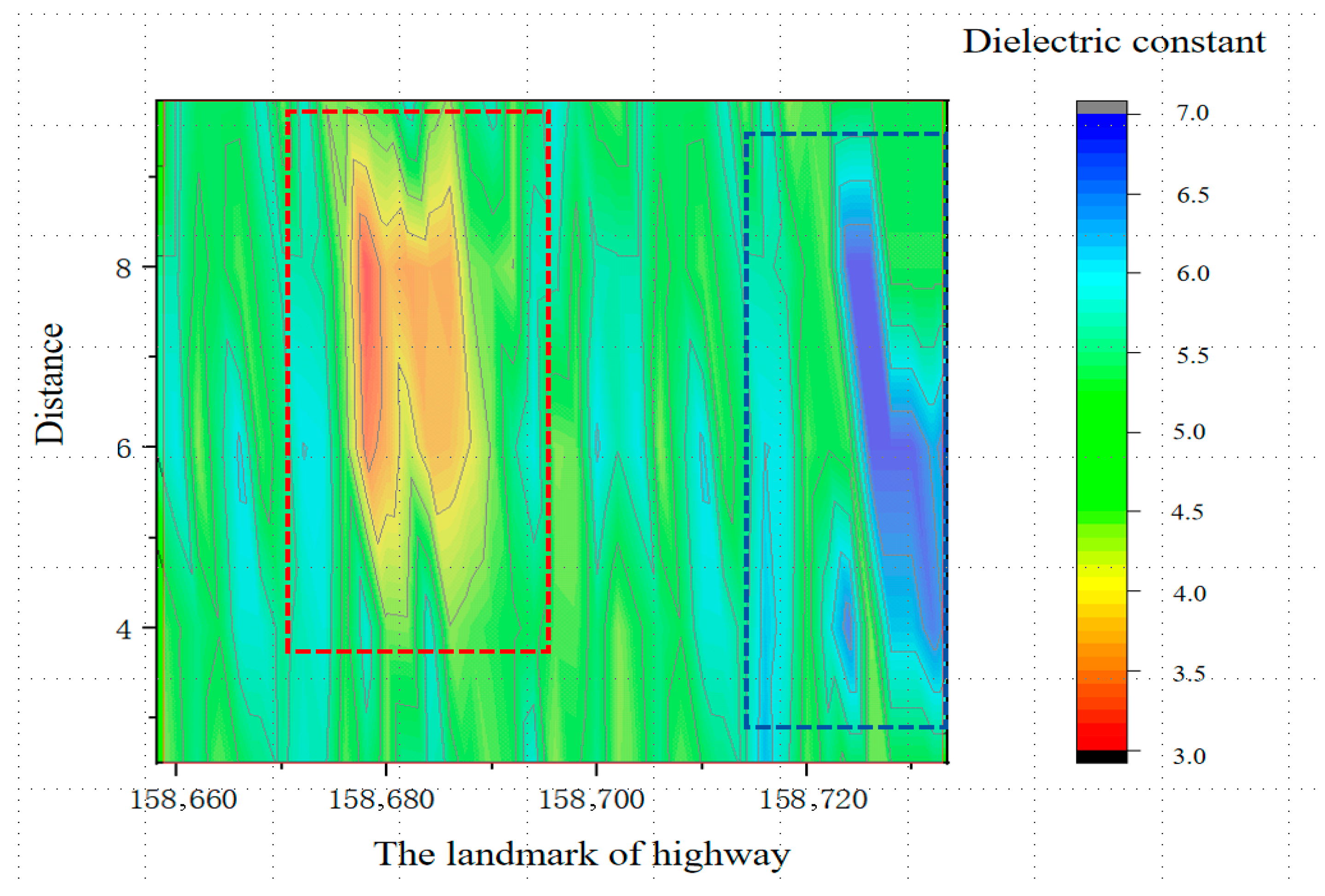 The test section for this investigation measured 96 m in length and 16.5 m in width. To ensure complete coverage of the area, a total of 11 parallel survey lines, each 96 m long, were established based on the optimal detection width (1.5 m) of the 3D ground-penetrating radar (GPR). Data acquisition was conducted using simultaneous conventional detection and common midpoint mode, with a sampling interval set at 5 cm. Each survey simultaneously captured data from 21 channels, resulting in a total of 21,000 depth data points per acquisition. To comprehensively cover the test section and ensure data accuracy, the system acquired 364 data points within each standard 2 m × 2 m grid. The dielectric constant representative of each grid was determined by calculating the average of these 364 individual dielectric constant values.