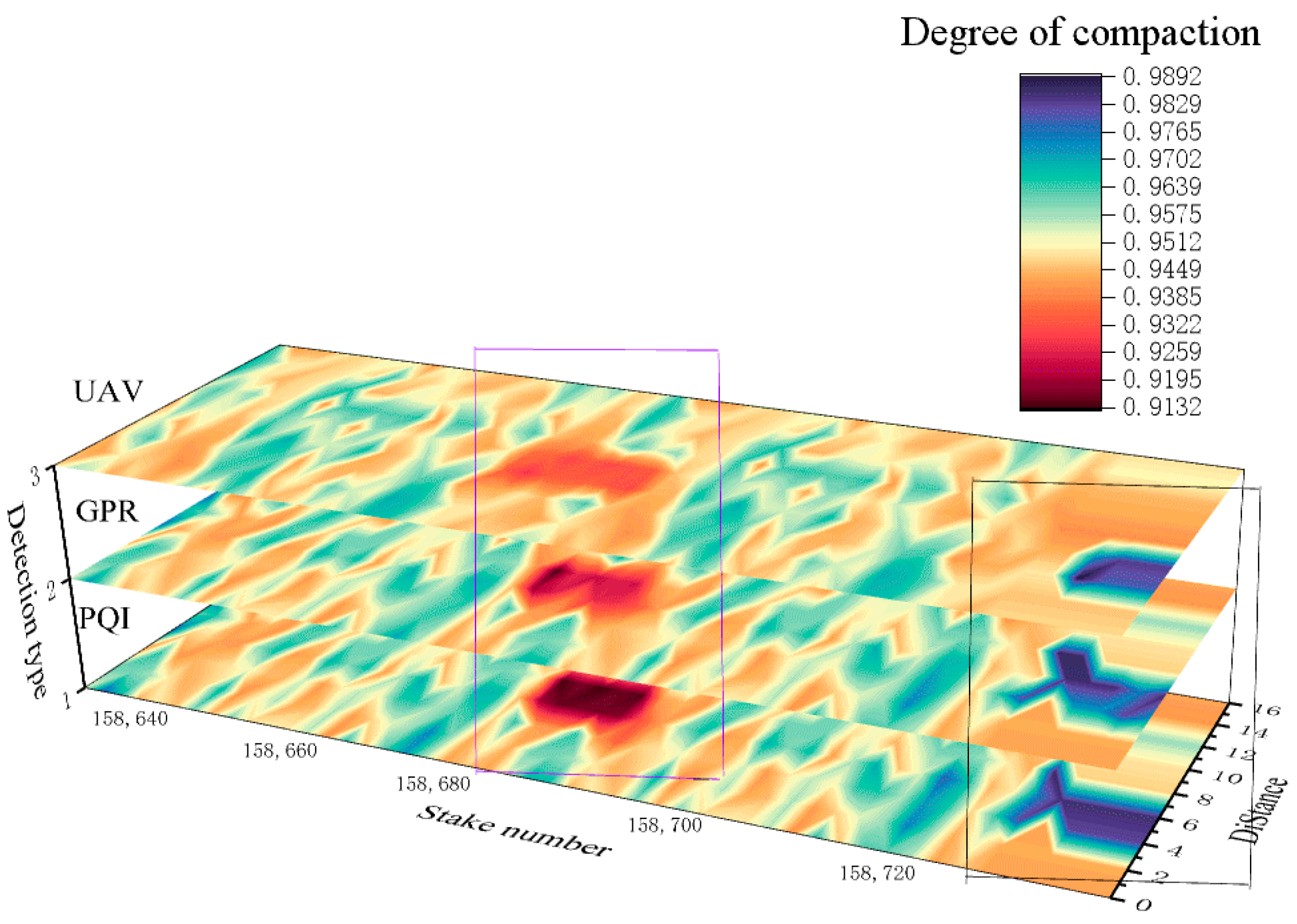 This method effectively integrates the advantages of the three aforementioned technologies, enabling a comprehensive “point-line-area” data fusion and validation across multiple scales and throughout the entire construction process. It establishes a complete cognitive loop for understanding asphalt pavement compaction quality, ranging from the macroscopic to the microscopic level.