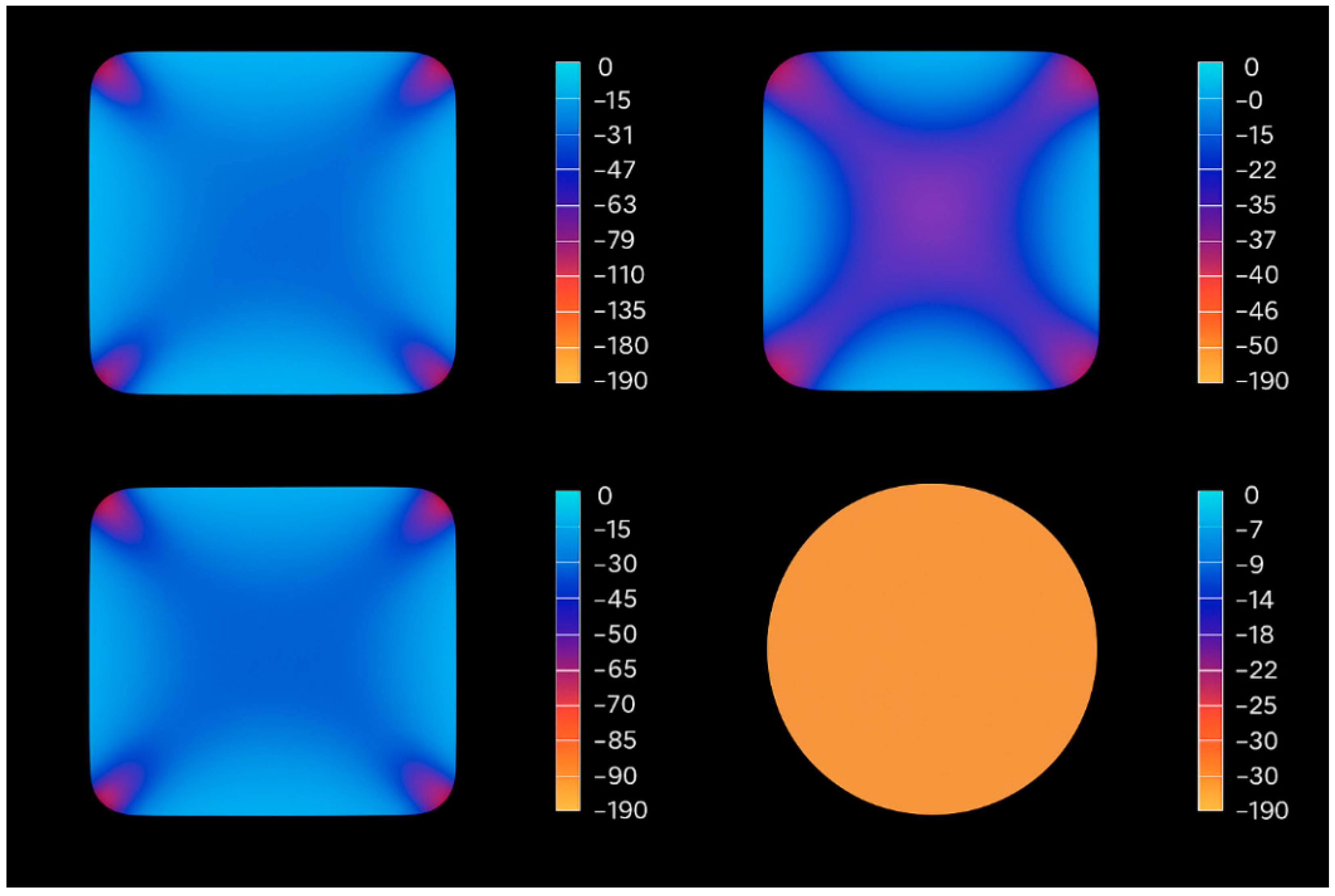 While most previous studies have focused on circular columns, square and rectangular columns are more commonly found in real-world engineering applications. It is therefore essential to investigate these column types to better estimate the strength enhancement provided by CFRP composites. In non-circular sections, the confinement pressure is not uniformly distributed; the concrete enclosed by the four curved regions (parabolas) experiences greater confinement. As shown by Oliveira and Carrazedo [5], the distribution of stresses within the confined section reveals that the effectively confined area varies depending on the shape and aspect ratio of the cross-section (see Figure 1).