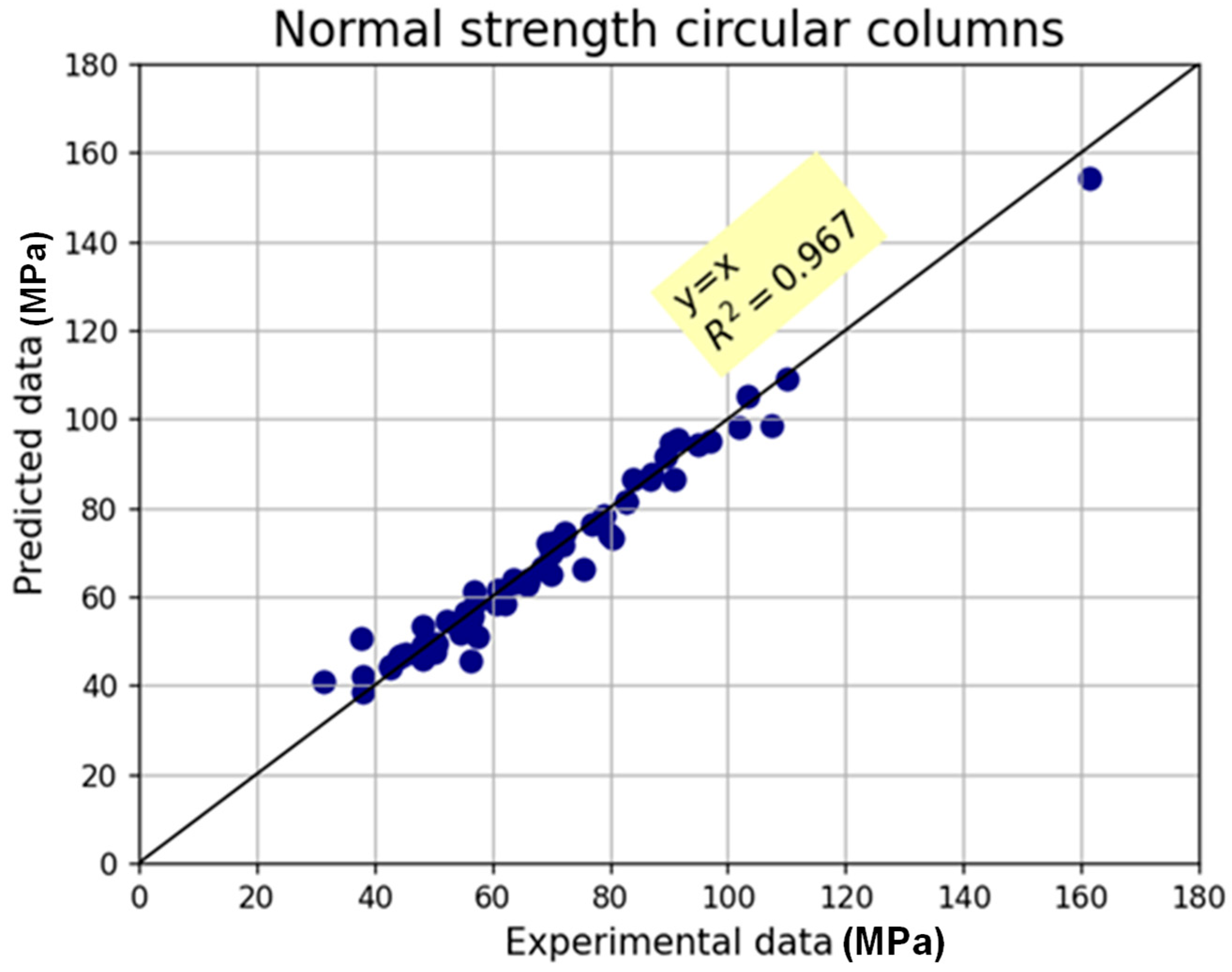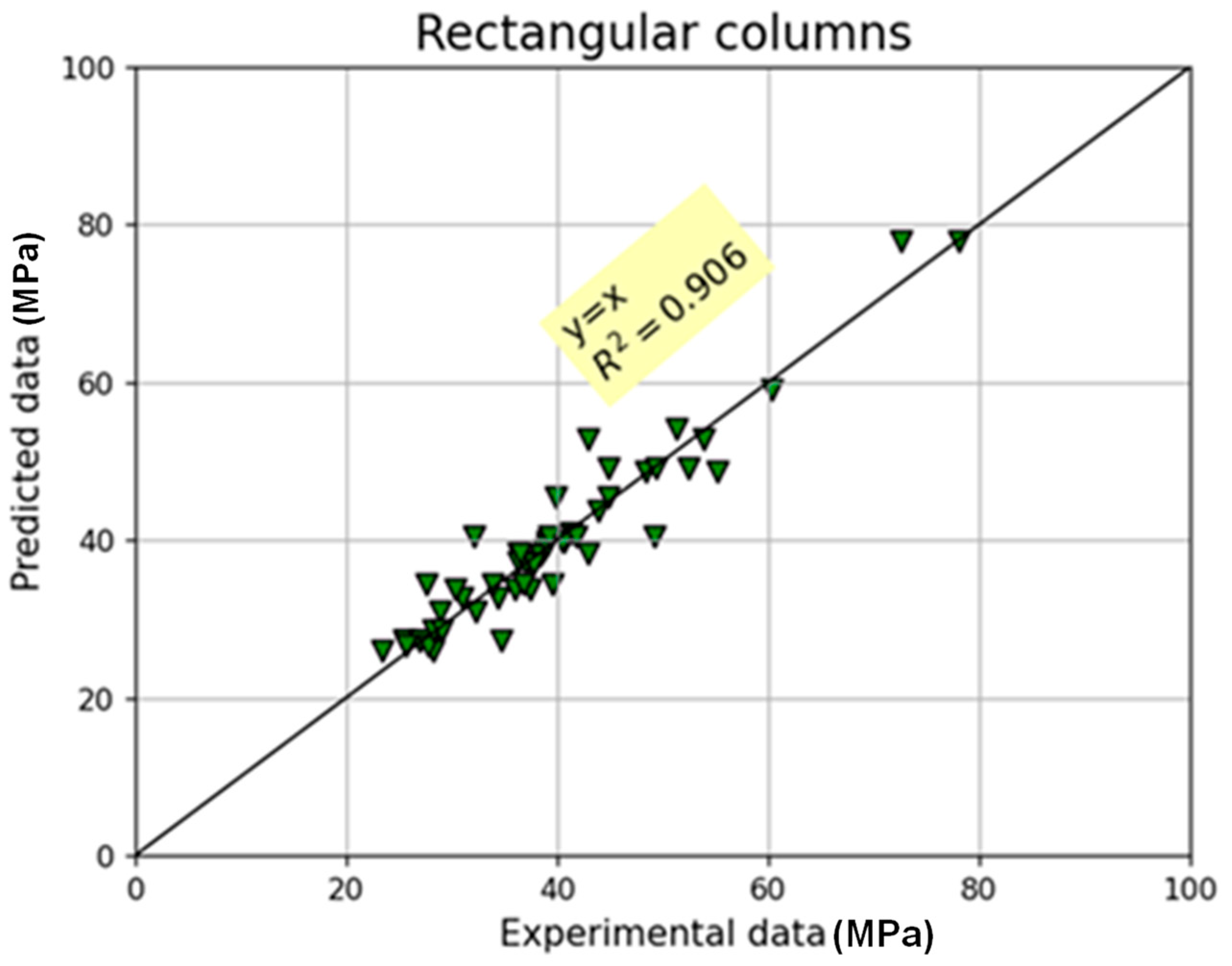 On the other hand, Berradia et al. [36] employed artificial neural networks (ANNs), demonstrating that these models offer greater accuracy, efficiency, and precision than traditional empirical equations in predicting the axial load-carrying capacity of circular columns confined with various FRP composites (carbon FRP, glass FRP, and aramid FRP). Similarly, Ali et al. [37] compared the performance of experimental models and ANNs, concluding that deep neural networks (DNNs) and convolutional neural networks (CNNs) show strong potential for future applications. Nistico et al. [38] compiled and compared data for square and circular columns reinforced with different types and configurations of fiber-reinforced polymers (e.g., strips, wraps, tubes), considering the influence of cross-sectional shape and FRP type on performance outcomes.