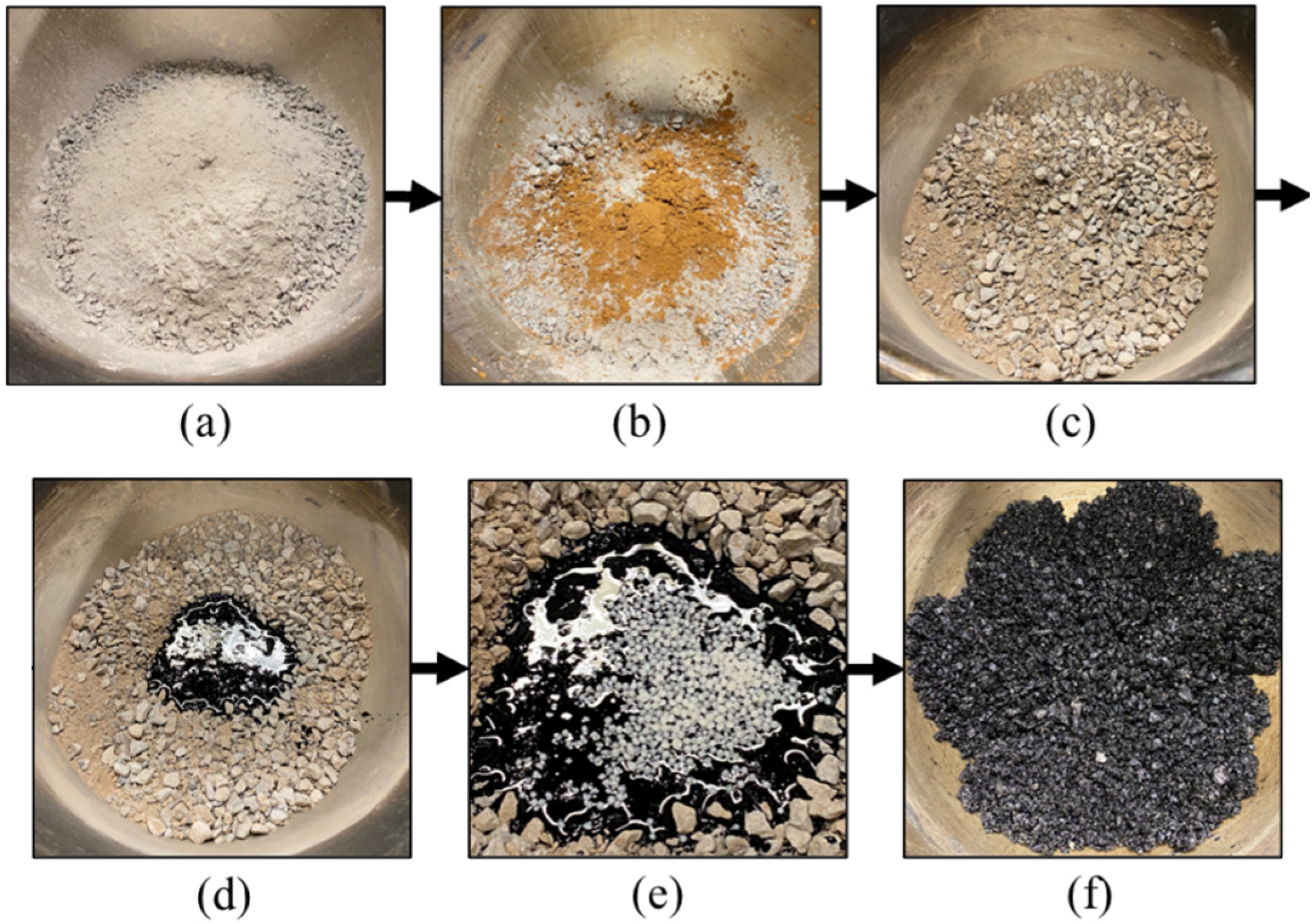 Mixing protocol of mix containing lignin and Sasobit (WMA-20L3S): (a) adding aggregates, (b) adding Kraft lignin, (c) mixing aggregates and Kraft lignin, (d) adding bitumen, (e) adding Sasobit prills and, (f) mixing all materials with a mechanical.