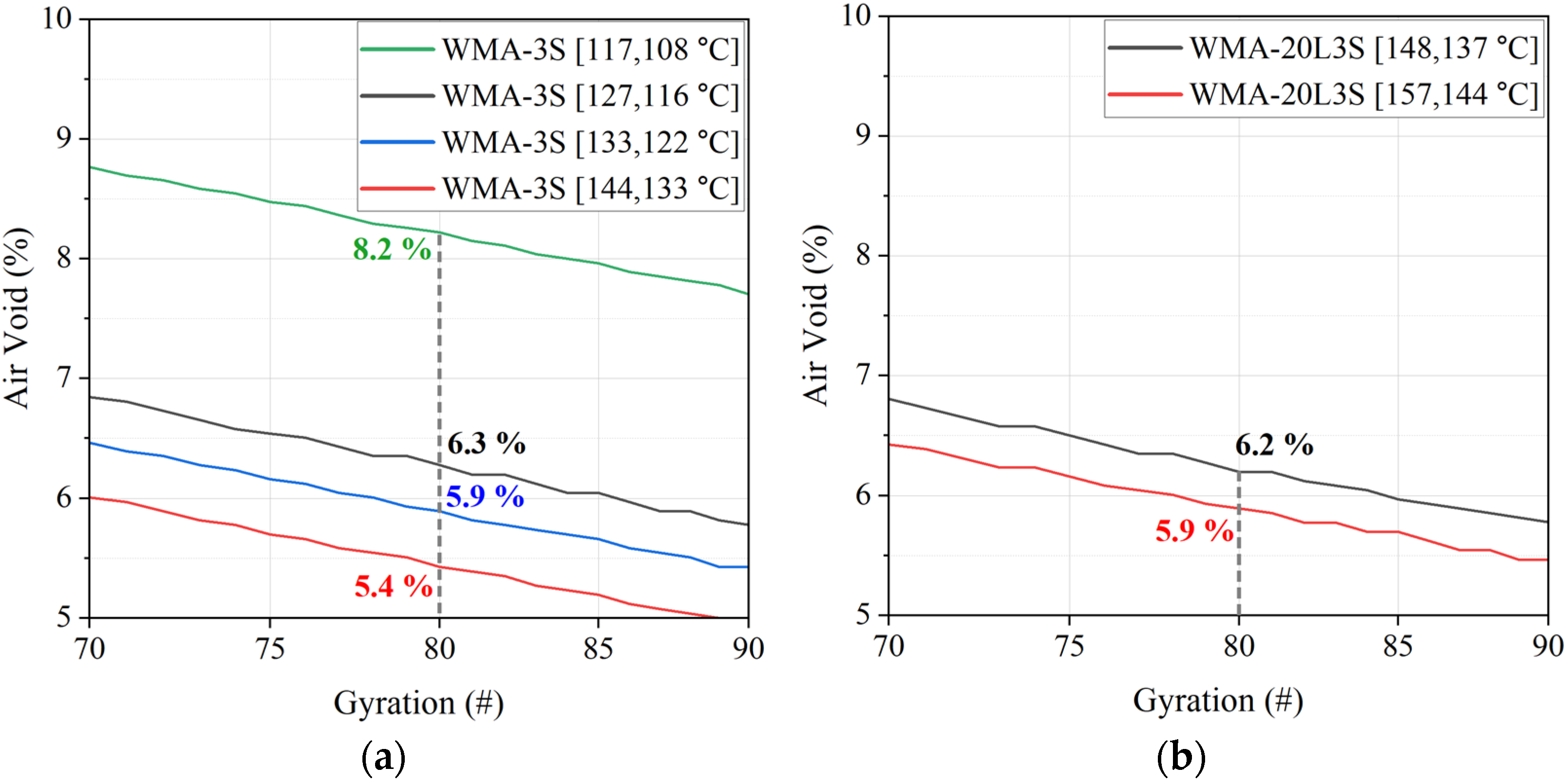 Air void content at 80 gyrations for: (a) WMA-3S and, (b) WMA-20L3S mixes at varying construction temperatures [Tmixing, Tcompaction].