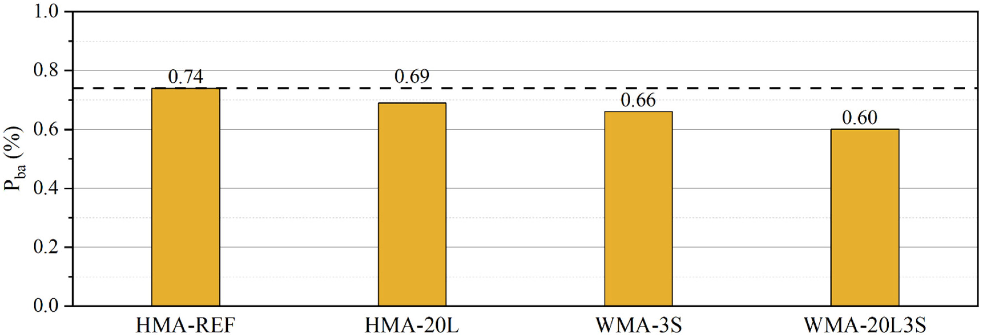 Percentage of binder absorbed by the aggregate (Pba) for all mixes.