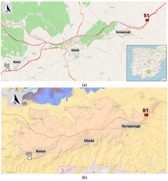 The two soil samples, S1 and S2, were collected from the same geological unit mapped as “Porcuna–Baeza Unit, Blue and White Marls, Sandstones and Marls. Locally Conglomerates. Turbiditic Systems.”, according to the Continuous Geological Map of Spain, scale 1:50,000 [26]. This unit comprises fine-grained basin marls with alternating calcareous and clayey layers that display relatively homogeneous mineralogical and geotechnical characteristics across the mapped area. The fact that both sampling points fall within this same marly unit supports the comparability of soil samples S1 and S2 and explains their similar classification as expansive marly clays (Figure 1b). Figure 1b shows the sampling locations within this geological context.