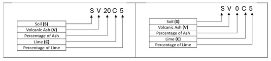 Figure 2 shows an example of the nomenclature of mixture SV20C5, which describes a 20% dry weight of volcanic ash (V-C3) added with respect to the dry weight of the base soil (S), with the addition of a 5% dry weight of lime (C-1) with respect to the dry weight of volcanic ash (V-C3). The 5% lime dosage was selected as a representative activator content commonly used in previous studies on volcanic ash–lime systems, balancing reactivity and sustainability. Reported activator contents typically range between 2 and 6% ([6,22]), making 5% an efficient and widely adopted value for early pozzolanic activation. If the mixture does not contain volcanic ash (V-C3), the weight of lime (C-1) is directly referred to the dry weight of soil (S).