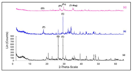Diffractogram and analysis for (a) S1 (SV0C0), (b) lime C-1, and (c) volcanic ash V-C3. (Q) quartz, (C) calcite, (P) portlandite, (Ol) olivine, (Px) pyroxene, (Pl) plagioclase, (Ti-Mag) Ti-magnetite.