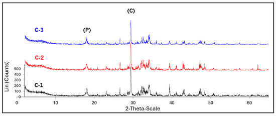 In addition, the lime used was periodically analyzed to verify the preservation of its activation capacity. XRD tests were performed on three different samples, i.e., C-1, C-2, and C-3, collected at 30-day intervals during storage. The corresponding diffractograms (Figure 7) and crystalline-phase quantification (Table 8) show that calcite (CaCO3) remained relatively stable, increasing only slightly from 27.8% to 31.6%, which indicates limited carbonation during storage. Conversely, the portlandite (Ca(OH)2) content remained within the range of 8.4% to 10.5%, substantially lower than the typical content of freshly hydrated lime (≥80% according to PG-3, Part 2, 200.3; [45]) and below the supplier’s specification. This moderate reduction in portlandite content suggests partial carbonation during storage; however, the persistence of measurable portlandite demonstrates that the lime retained sufficient alkalinity and reactivity to act effectively as a pozzolanic activator when combined with volcanic ash V-C3. This observation confirms that the monitored lime remained functional throughout the testing period and, importantly, that its reactive state was quantitatively verified rather than assumed, strengthening the methodological rigor of this study.