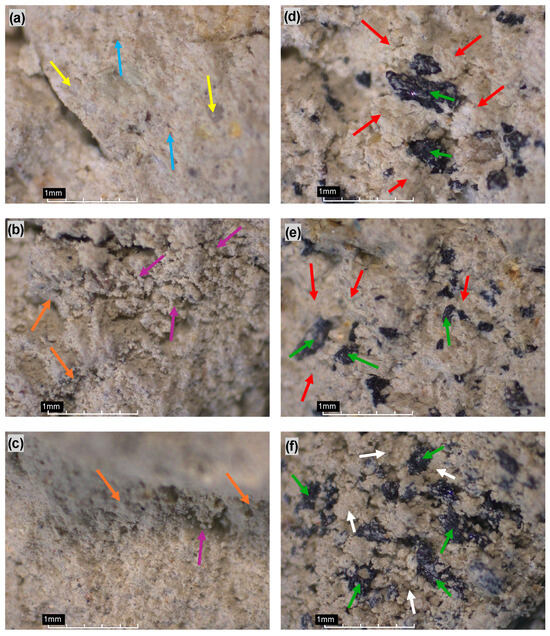 Optical images with 40X magnification maximum range: (a) SV0C0, (b) SV0C3, (c) SV0C5, (d) SV20C5, (e) SV30C5, and (f) SV30C0. Arrows, green—volcanic ash particles V-C3; yellow—quartz; light blue—smooth surface, plastic clay; red—cemented structure (C-S-H/C-A-H) around volcanic ash particles V-C3; magenta—flocculation of grains; white—dispersed material around volcanic ashes; orange—C-S-H gel.