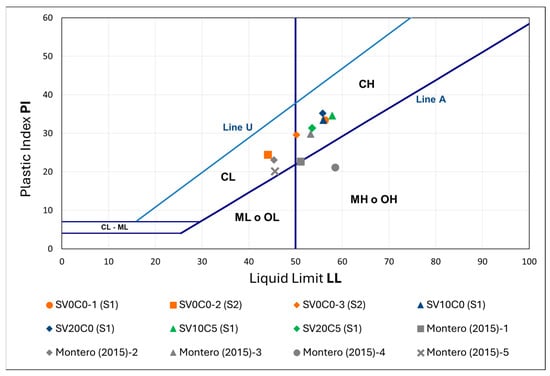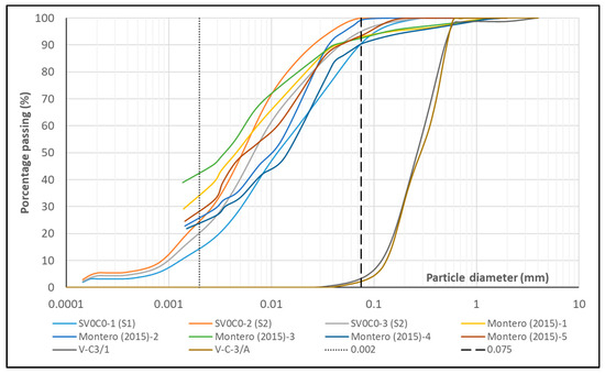 Figure 10 presents the grain size distribution curve for soil samples S1 and S2 (designated SV0C0). The analysis was performed using conventional sieve testing for particle sizes greater than 700 μm, combined with a laser technique using Honeywell Microtrac X100 equipment for particles smaller than 700 μm. The soils exhibit 90% and 99% of fines (i.e., <75 µm) and a clay fraction (<2 µm) in the order of 22%. The results are consistent with previous characterization reported by Montero and Estaire [24] and Vázquez-Boza [30], confirming the similarity of the granulometric range obtained for the base soil (S1 and S2). Table 10 shows the percentage of the fine fraction for the soils studied.