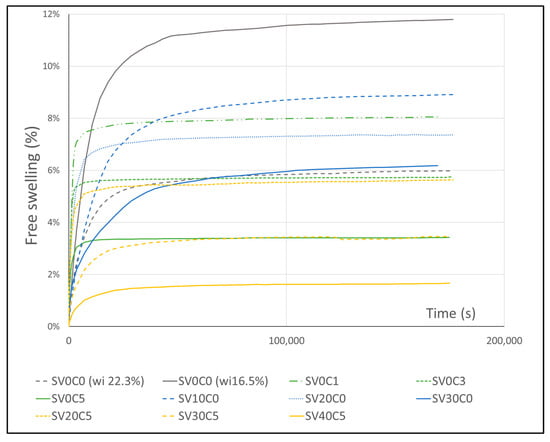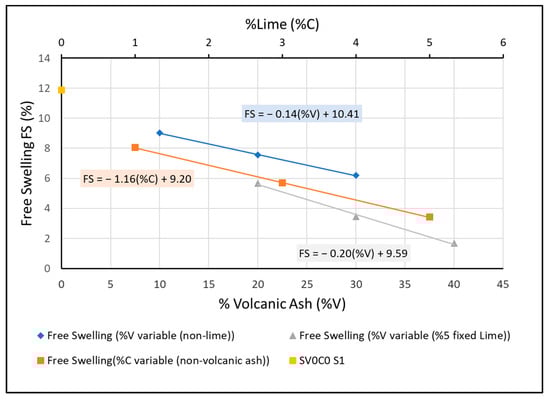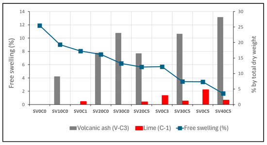 To improve the pozzolanic activity of this volcanic ash and to provide a satisfactory mix with highly plastic clays, different cementitious additives, such as lime, cement, or cement kiln dust, are usually applied [34]. Accordingly, lime (C) was incorporated into the soil–volcanic ash (V-C3) mixtures in this study to ensure adequate activation and performance. In addition, to enable a direct comparison of free-swelling behavior, lime (C) was also added alone in low proportions (1%, 3%, and 5% of the dry soil weight), thereby limiting its dosage to evaluate its isolated contribution.