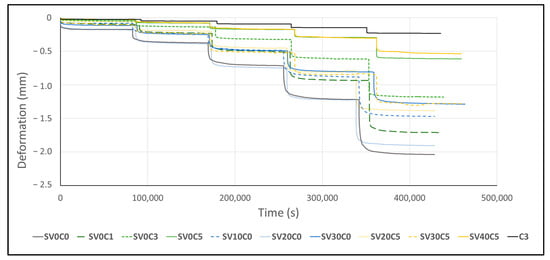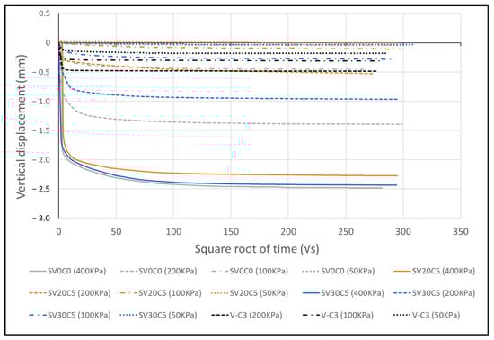 During the consolidation stage (Figure 21), greater applied loads resulted in larger vertical deformations, although the curves for the stabilized mixtures tended to converge under the highest normal stress (400 kPa). Compared with the untreated soil, the stabilized specimens exhibited reduced initial compressibility and more stable volumetric behavior over time.