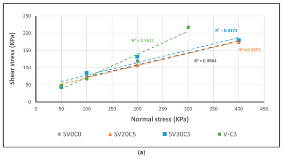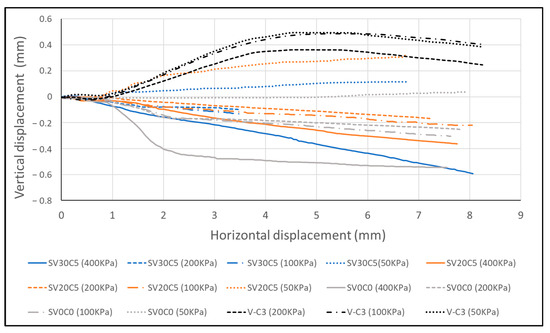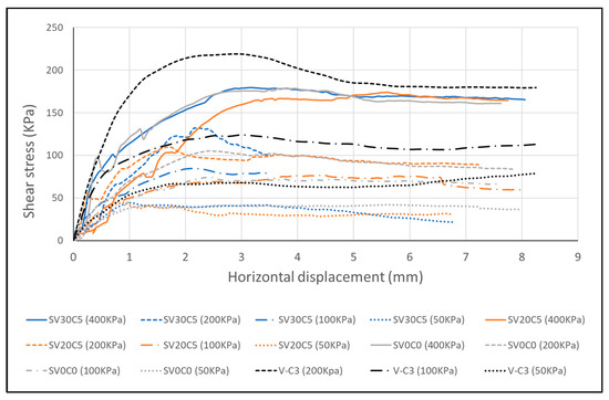 Figure 19 shows that the mixtures incorporating volcanic ash and lime (SV20C5 and SV30C5) achieved slightly higher peak strength than the untreated soil (SV0C0), while residual strength remained broadly similar, with stress–displacement curves converging at large horizontal deformation. Under normal stress of 50 kPa, all specimens exhibited dilative behavior, whereas higher stresses (100, 200, and 400 kPa) produced predominantly contractive responses.