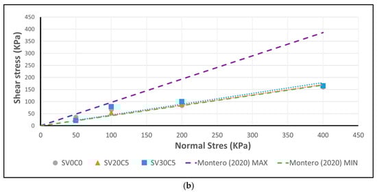 (a) Correlation between shear and normal stress for peak shear strength. (b) Residual strength envelopes of base soil SV0C0 (S2) and mixtures SV20C5 and SV30C5, compared with the results reported by Montero and Estaire [25].