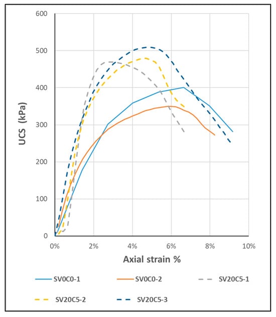 We evaluated the strength properties of the soil and its potential improvement compared to specimens SV0C0 and SV20C5, both prepared using the base natural soil S1. The tests were conducted immediately after specimen preparation, i.e., under short-term conditions, and at the corresponding optimum moisture content and maximum dry unit weight, as reported in Table 17.