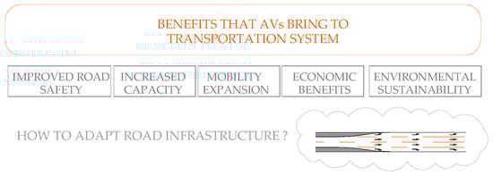 Considering the potential benefits that AVs bring to the transportation system, such as increased safety, increased capacity, enhanced mobility for immobile, underage, and elderly people, economic advantages, and reduced negative environmental impact, there is significant discussion in scientific circles about the possibilities of changing road infrastructure in the future (Figure 1) [16,17,18,19,20,21,22,23,24].