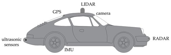 Their characteristics are as follows: GPS—enables localization and navigation; IMU—provides data on vehicle acceleration, orientation, and angular velocity; odometry sensor—determines position changes over time; gyroscope—measures or maintains orientation and speed; magnetometer—for navigation and tracking; camera—records visual information about lane markings, signs, traffic lights, pedestrians, other vehicles, etc.; RADAR detects objects and their speed; LIDAR—creates 3D maps of the environment and measures the distance to nearby objects; ultrasonic sensors—for close-range detection when parking or maneuvering [7,41].