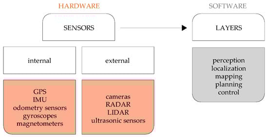 An AV makes decisions about its environment based on data obtained from sensors in the vehicle (hardware) and decision-making algorithms (software). Using various sensors on and in the vehicle, AVs register, collect, analyze, and share data about their environment (e.g., traffic system, pedestrians, time of day, weather) [39]. Figure 3 shows sensors on and inside the vehicle, while Figure 4 schematically represents how AVs collect and process environmental data. The sensors can be internal (proprioceptive sensors) or external (exteroceptive sensors). Internal sensors include GPS (Global Positioning System), IMU (Inertial Measurement Unit), odometry sensors, gyroscopes, and magnetometers. External sensors include cameras, RADAR (Radio Detection and Ranging), LIDAR (Light Detection and Ranging), and ultrasonic sensors [40].