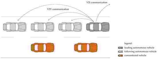 The leading vehicle transmits information about its speed, acceleration, and position to the following vehicle. By using Cooperative Adaptive Cruise Control (CACC), the following vehicle can maintain a short distance and still avoid collisions (Figure 5) [48]. CACC is an advanced adaptive cruise control (ACC) technology that uses V2V and V2I communication, allowing closer following distances and improved traffic flow [49]. ACC and CACC technologies are widely analyzed by researchers through microscopic simulations and models based on real-world data [50].