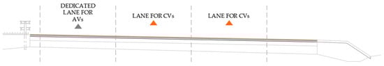 The safety risk in mixed traffic flow can be minimized by using dedicated lanes. In addition to reducing safety risk, dedicated lanes can help other road users more easily adopt AVs in the near future. These are usually the innermost lanes of multi-lane roads (Figure 6) [50].