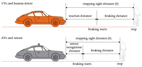 Stopping sight distance (S) is the sum of the distance traveled during reaction time and the distance traveled during braking [84]. The length of reaction time depends on the driver’s attention and response, while the length of braking depends on the mechanical characteristics of the vehicle. Reaction time is a parameter that affects stopping sight distance. Since AVs are equipped with sensors whose time to detect obstacles (ts) on the road (0.2 s–0.5 s) [67,82,83] is significantly shorter than the driver’s reaction time (td) (1.5 s–2.5 s) [82,83], it has been concluded that stopping sight distances on highways could be reduced by 21% to 33%, depending on the operating speed (Vo) (Figure 7 and Figure 8) [72].