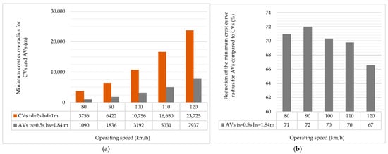 Crest curve radii: (a) for CVs (the driver’s eye is 1.0 m above the ground) and AVs (the sensors are 1.84 m above the ground); (b) reduction for AVs compared to CVs.