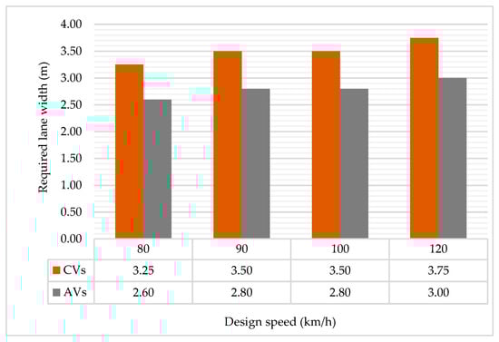 Lane width depends on design speed and, according to [84], ranges from 2.75 m to 3.75 m. Changes to the road cross-section are planned due to a possible reduction in lane width for AVs to up to 2.4 m [83]. The authors of [82] state that lanes not used by buses and heavy vehicles could be between 2.4 m and 2.7 m wide. Another study [72] has shown that lane width could be reduced by 0.65 to 0.75 m by using the Lane-Keeping System (LKS), which allows AVs to drive continuously in the center of the lane [16], and by reducing the lateral safety width used as safety buffers between vehicles. In a study conducted in Great Britain [85], the authors presented five new optimized highway cross-sections with non-standard dimensions. The outer lane next to the hard shoulder was always reserved exclusively for autonomous freight vehicles. They also varied the lane width from 2.5 m to 5.0 m and their number of lanes from 3 to 4. Figure 11 shows a comparison of lane widths for CVs according to Croatian regulations [84] and the reduced lane widths for AVs according to [72].