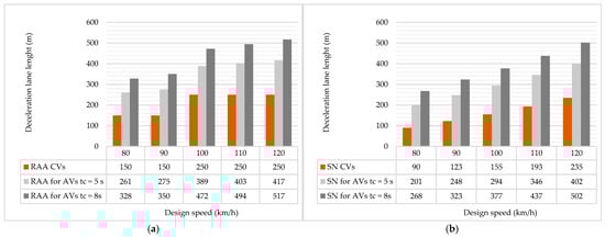 Equation (1) is derived from the equation for determining speed. The speed is given in kilometers per hour (km/h) and divided by 3.6 to obtain the length in meters (m). When calculating the extension of the deceleration lane ∆L, data from the above-mentioned literature [88] was used, which states that the takeover time (tc) is 5 s or 8 s. The calculated extensions (∆L) were then added to the existing lengths of deceleration lanes (LA) for design speeds of 80 km/h to 120 km/h prescribed in the German guidelines for the design of highways (RAA) [90] and the Swiss norm (SN) [91], resulting in the total length of deceleration lanes (Lu) adapted to the operation of AVs (Figure 12 and Figure 13) [89]. As shown in Figure 13, the total length of the deceleration lanes (Lu) adapted to the operation of AVs can be more than twice as long as the total length of the deceleration lanes (Lu) for CVs, depending on the takeover time (tc) [89].