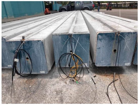 Full-scale precast RC beams with pre-installed fixed-point DFOS cables bonded in longitudinal grooves prior to load testing.
