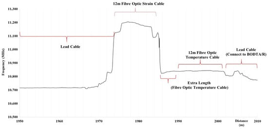 Prior to mechanical loading, the complete test configuration—including supports, loading points, fiber routing, and anchor fixities—was verified as shown in Figure 3. Brillouin frequency baselines were then recorded along all instrumented segments to establish the zero-strain reference and confirm optical integrity. Representative baseline spectra are presented in Figure 4 and Figure 5, showing smooth, piecewise-uniform frequency distributions without step losses, reflections, or discontinuities attributable to splices or micro-bending effects. The absence of local spectral anomalies indicates proper adhesion of the cable within the groove and stable coupling between the sensing fiber and the host concrete.
