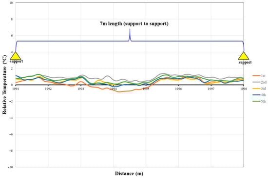 The combined results confirm that both the strain and temperature channels maintained optical continuity along their full lengths, validating the installation procedure and providing a robust baseline for subsequent interpretation of load-induced responses. Repeating unloaded acquisitions confirmed short-term repeatability for both the strain cable (Figure 6) and the temperature channel (Figure 7), consistent with accepted Brillouin DFOS practice for establishing a zero-state prior to mechanical loading [1,2,23].