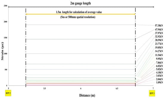 Monotonic loading was applied incrementally as summarized in Table 2, up to a peak load of 57.38 kN. At each load level, a 3–5 min hold period allowed stabilization and crack inspections. During each hold, DFOS strain and temperature profiles were collected as time-averaged traces (several scans per step), while LVDT, FSG, and VWSG measurements were logged continuously. Distributed strain was analyzed as both full-span profiles between internal fixities (IFP1–IFP4) and as long-gauge averages between adjacent fixities (e.g., 1.5 m sub-segments between IFP2–IFP3), consistent with the fixed-point cable concept shown in Figure 1.