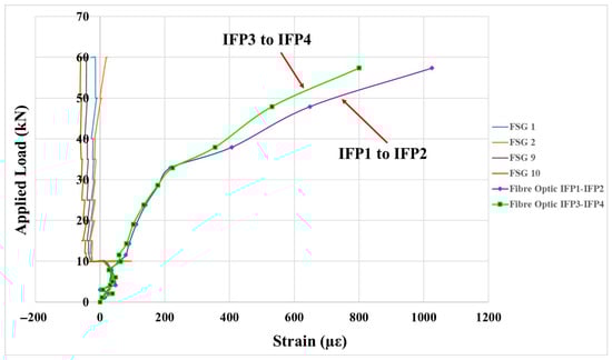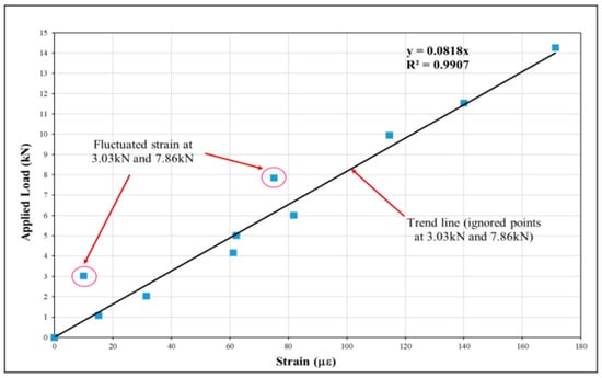 Global strain response exhibited high linearity with applied load (R2 ≈ 0.99), with only minor deviations at early load stages (Figure 13), consistent with DFOS trends reported for RC members [3,5,6,7,8,12,13].