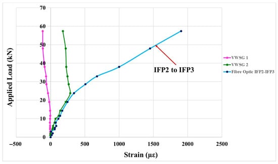 DFOS long-gauge strains closely matched foil strain gauges and followed the same trend as vibrating-wire gauges (Table 4 and Table 5, Figure 14). At higher loads and through cracking, DFOS maintained signal continuity where discrete sensors showed saturation or scatter (Figure 20, Figure 21 and Figure 22).