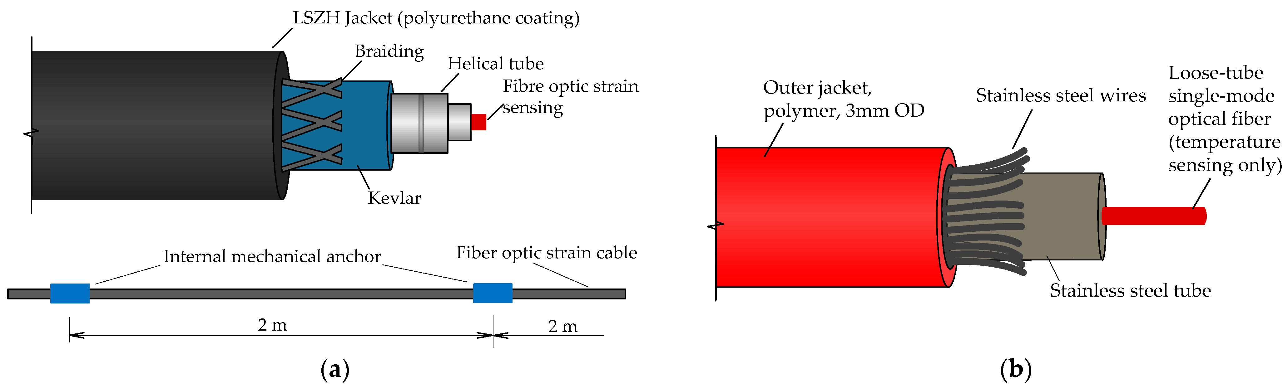 - Hénault, J.M.; Quiertant, M.; Salin, J.; Moreau, G.; Taillade, F.; Delepine-Lesoille, S.; Benzarti, K. Analysis of the Strain Transfer Mechanism Between a Truly Distributed Optical Fiber Sensor and the Embedding Medium. In Proceedings of the 9th International Conference on NDE in Relation to Structural Integrity for Nuclear and Pressurized Components, Seattle, WA, USA, 22–24 May 2012; Available online: https://www.ndt.net/?id=14790 (accessed on 15 October 2025).