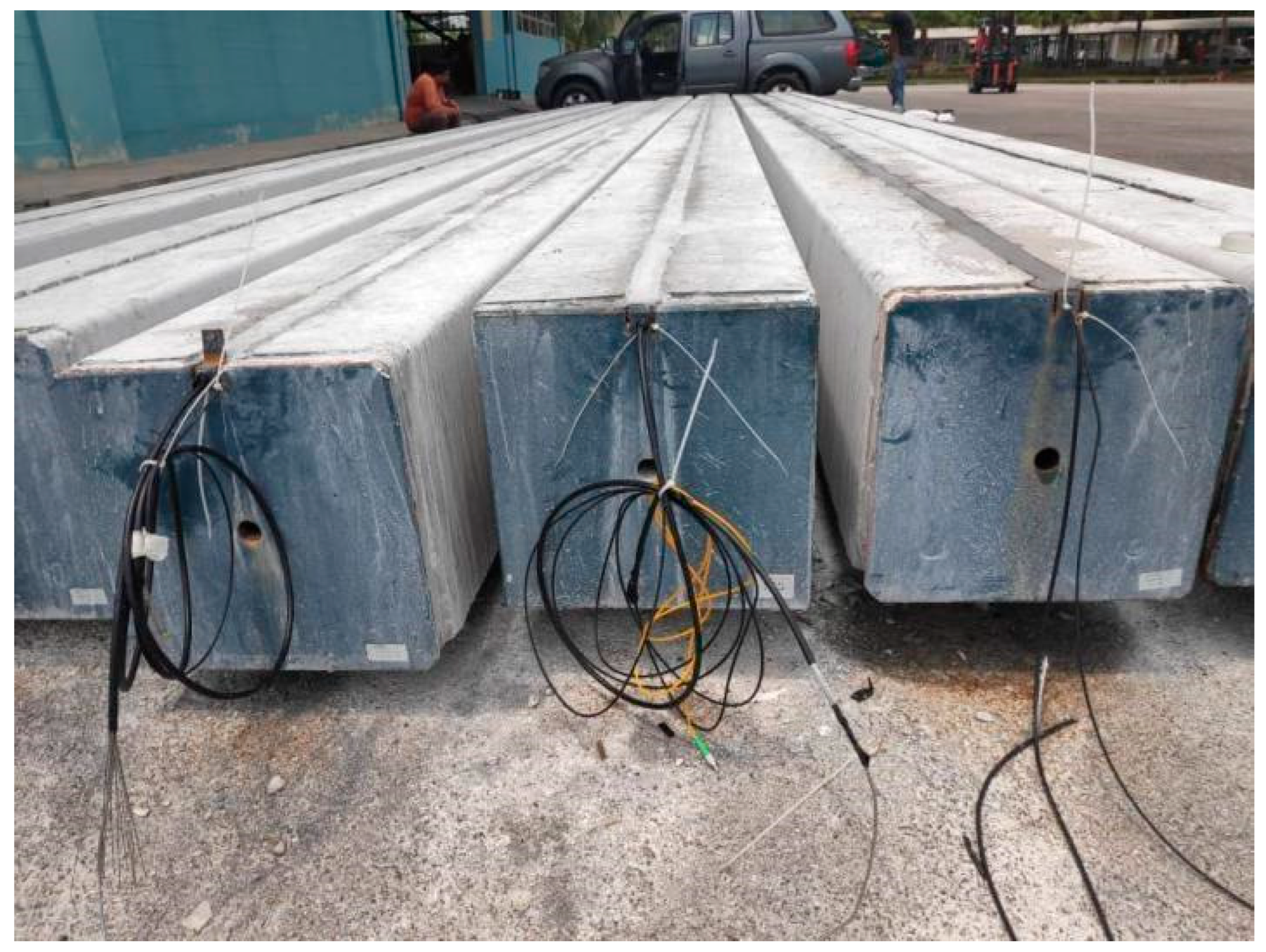 - Butler, L.J.; Gibbons, N.; He, P.; Middleton, C.; Elshafie, M.Z.E.B. Evaluating the Early-Age Behaviour of Prestressed Concrete Beams Using Distributed and Discrete Fiber Optic Sensors. Constr. Build. Mater. 2016, 126, 894–912. [Google Scholar] [CrossRef]