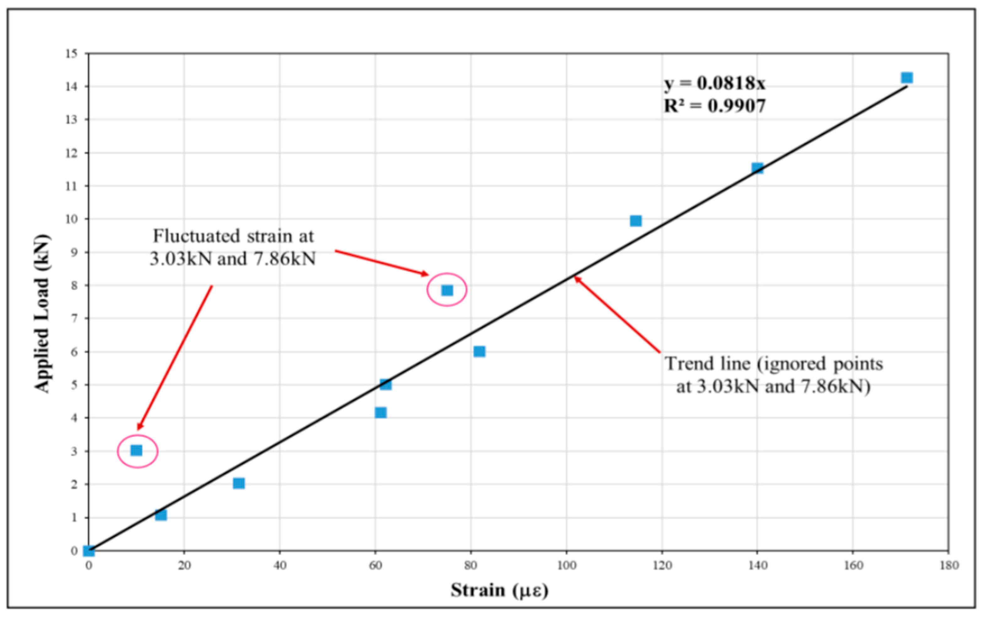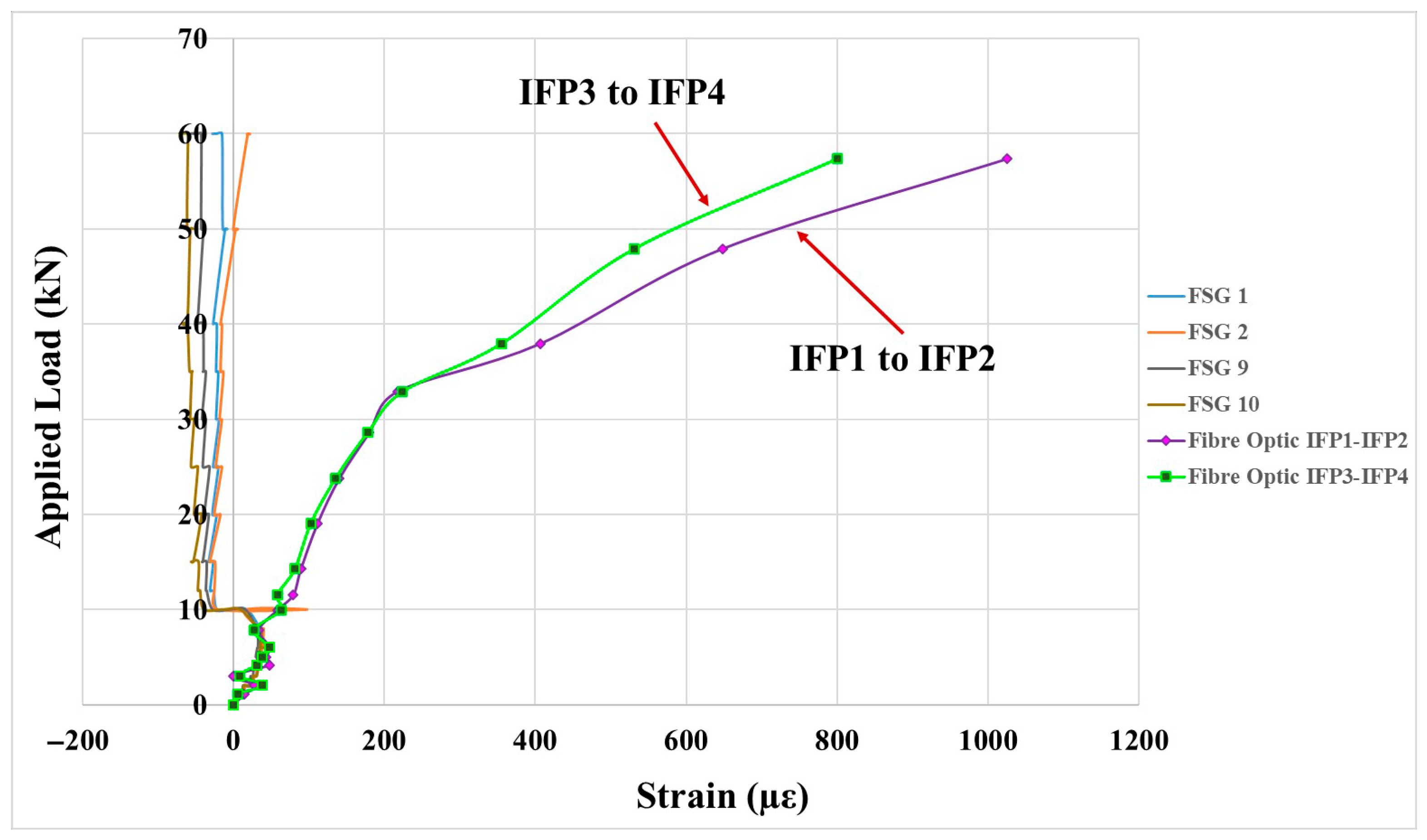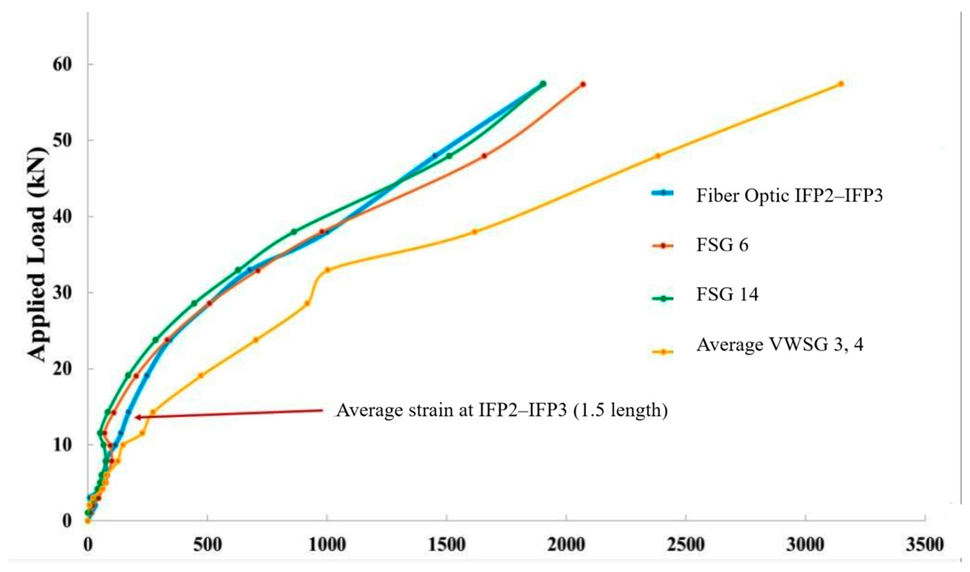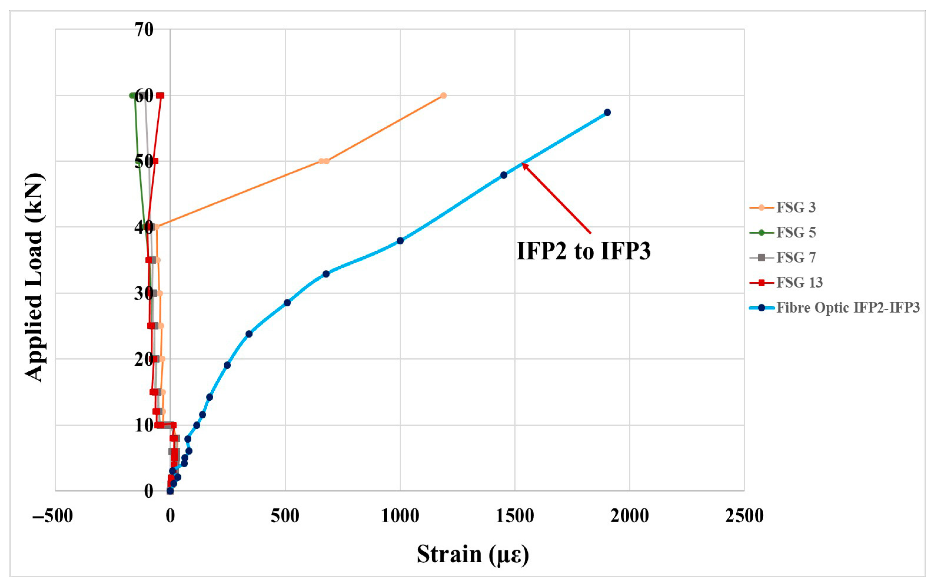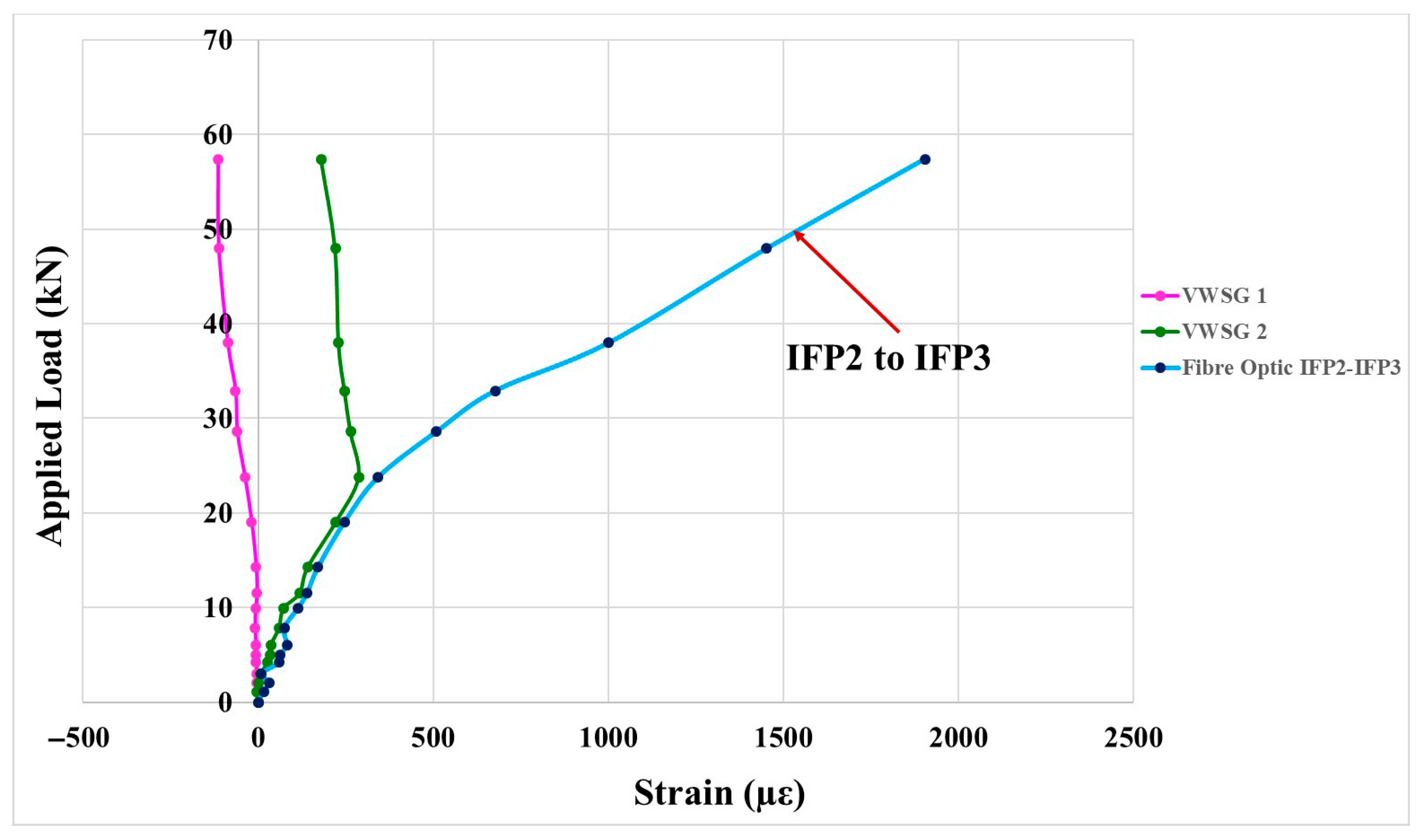 - Consistency in sign and magnitude between DFOS long-gauge averages and co-located FSG/VWSG readings under low-to-moderate loads.