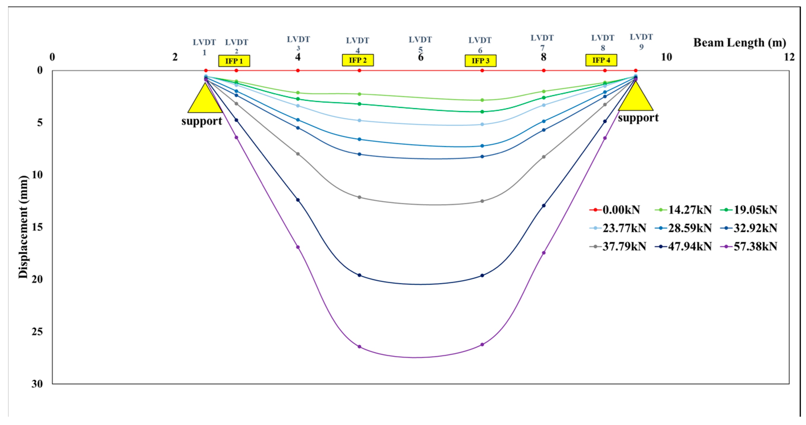 | LVDTs | HBM WA-T series (linear variable differential transformers) | Nine units placed along the beam; stroke and precision per manufacturer specifications | Measurement of deflected shape and load–deflection response |