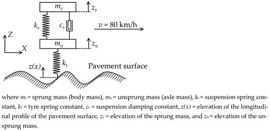 After solving the system of differential equations presented in Equations (1)–(3), the IRI can be calculated using Equation (4) [32]. As depicted in Figure 2, it is evident that at each instant, the force magnitude applied to the ground surface corresponds to the force in the tyre spring. By dividing this force by the total mass of the suspension system, the vertical acceleration, denoted by av, applied to the vehicle by the pavement surface can be calculated using Equation (5).