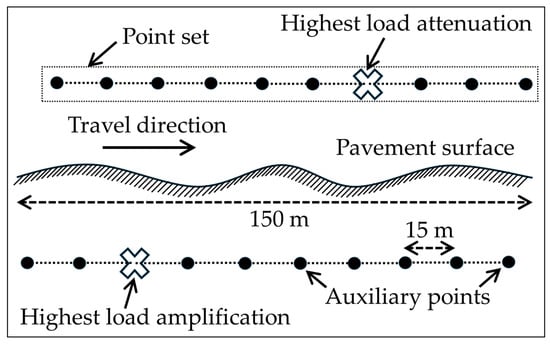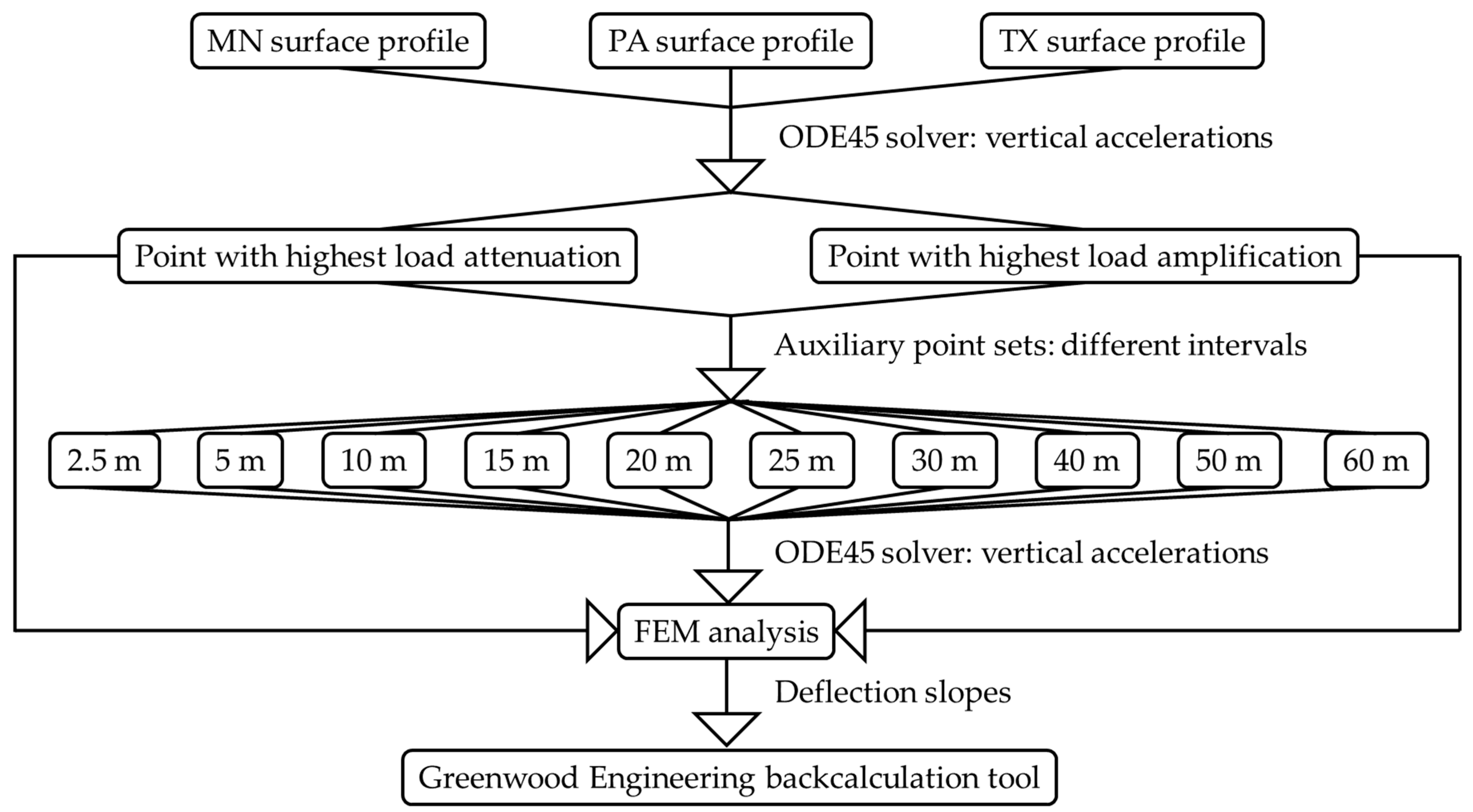 Figure 4 presents an overall flowchart of the methodology adopted in this study. Three distinct rough pavement surface elevation profiles, each spanning 150 m in length, were extracted from the Long-Term Pavement Performance (LTPP) Programme Standard Data Release (SDR) database [36]. The IRI values of the surface profiles were 2.77, 3.04, and 3.18 m/km, corresponding to surveys conducted in the states of Texas (TX), Pennsylvania (PA), and Minnesota (MN), respectively. Table 3 presents the details of each surface profile survey. Rough pavement surface profiles were selected, as they have a stronger effect on the DLC and the magnitudes of attenuated and amplified tyre loads caused by surface roughness [37]. The system of ordinary differential equations (ODEs) presented in Equation (3) for the golden car travel was solved numerically using MATLAB R2022b’s ODE45 solver [38], with the results input into Equation (5) to calculate tyre vertical accelerations along three surface profiles. This analysis identified two key locations on each profile where the highest attenuation and the highest amplification of tyre load magnitude occurred due to the effect of pavement surface roughness. For each of the points showing the highest attenuation and highest amplification on each of the three surface profiles, ten auxiliary point sets were defined, each having longitudinal point intervals of 2.5, 5, 10, 15, 20, 25, 30, 40, 50, or 60 m. As an example, Figure 5 illustrates a schematic of the points with the highest attenuation and amplification, along with their corresponding 15 m interval auxiliary point sets. Subsequently, the tyre vertical acceleration at each point in every point set was calculated by using Equation (5). The rear axle of a TSD was then simulated in three-dimensional (3D) ABAQUS [39] using the FEM as it travelled over a three-layer flexible pavement system. The dynamic load magnitude used in each FEM simulation was determined by decoupling vehicle vibration from pavement surface roughness and was calculated based on the tyre vertical acceleration previously obtained for the points with the highest attenuation and the highest amplification, along with their associated auxiliary points in each point set. Afterwards, deflection slopes were calculated at various offset distances from the centre of loading on the side equipped with Doppler laser sensors. These deflection slopes were entered into the Greenwood Engineering TSD backcalculation tool, either directly for each highest attenuation and highest amplification point or by averaging the deflection slopes of each highest attenuation and amplification point together with their corresponding auxiliary points in each point set. The backcalculated moduli of the pavement layers were then obtained.