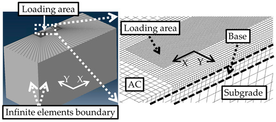 The 3D FEM model included only zones 1 and 2 from Figure 6, taking advantage of geometrical symmetry. The model dimensions were designed to extend at least 50 times the static loading radius from the centre of loading in the horizontal direction and 100 times the static loading radius in depth. Infinite elements were applied at the sides and bottom of the model to simulate an infinite medium for the soil layers [55]. The model used 20-node quadratic brick elements, with a mesh size of 25 mm directly under the load and a progressively coarser mesh further away. Dynamic implicit solving method was employed, with a maximum time increment of 0.001 s. The travel distance was set to 1 m along the pavement surface. Figure 8 illustrates the 3D FEM model, with a magnified section showing the mesh in the vicinity of the loading area.