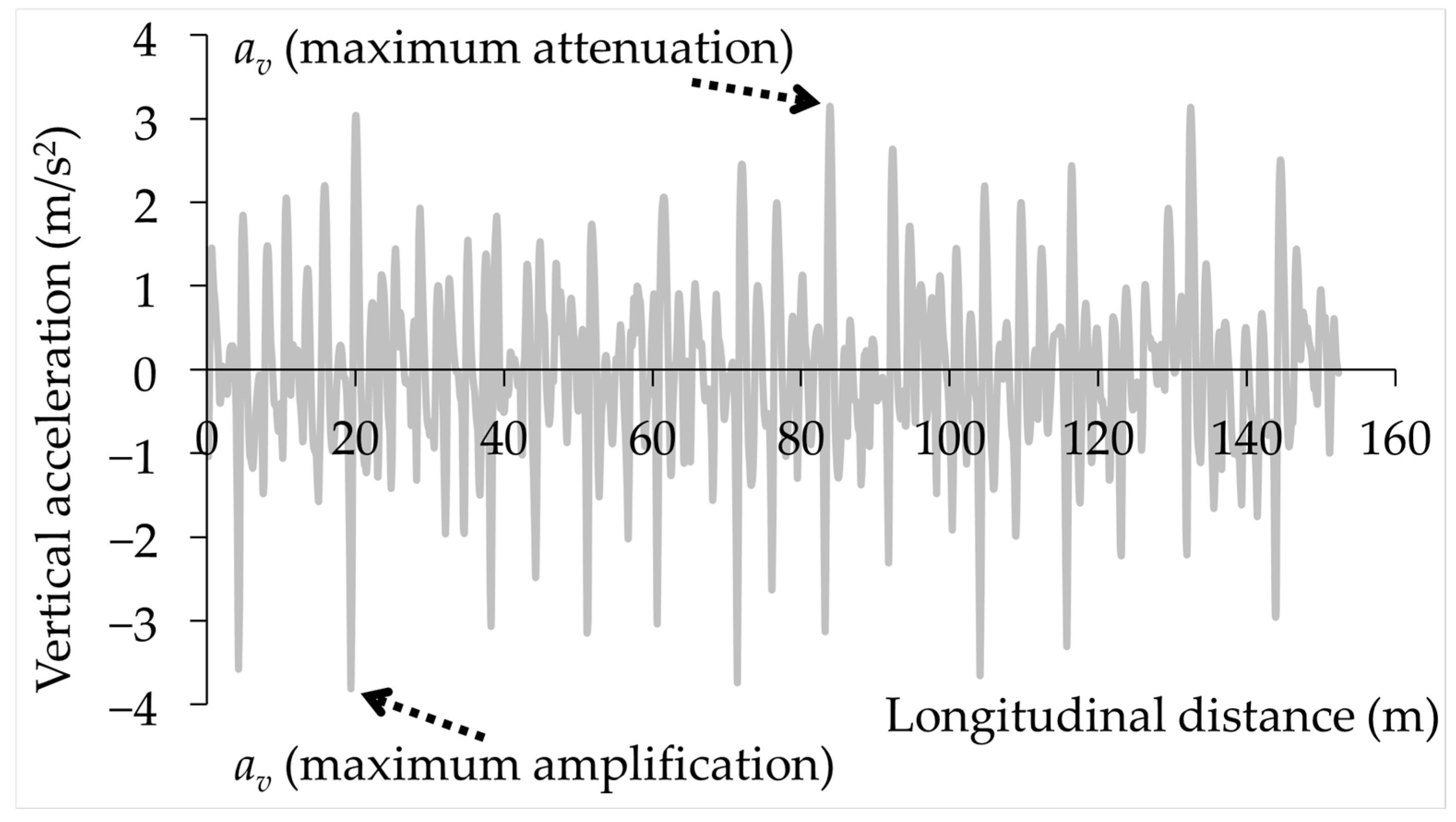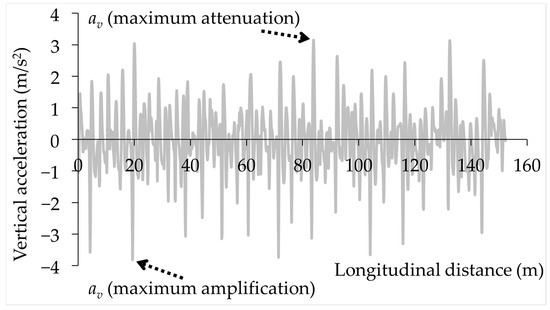 Table 5 presents the IRI values calculated using the ODE45 numerical solver for three surface profiles examined in this study, alongside the corresponding IRI values from the LTPP database. As shown, there is a close agreement between the two sets of IRI values, supporting the validity of the ODE45 solver implementation. To illustrate an example of vertical accelerations obtained from the ODE45 solver, Figure 9 shows the results from the analysis of the MN surface profile using Equation (5) and highlights the locations of maximum attenuation and amplification in the tyre load magnitude along the surface profile.